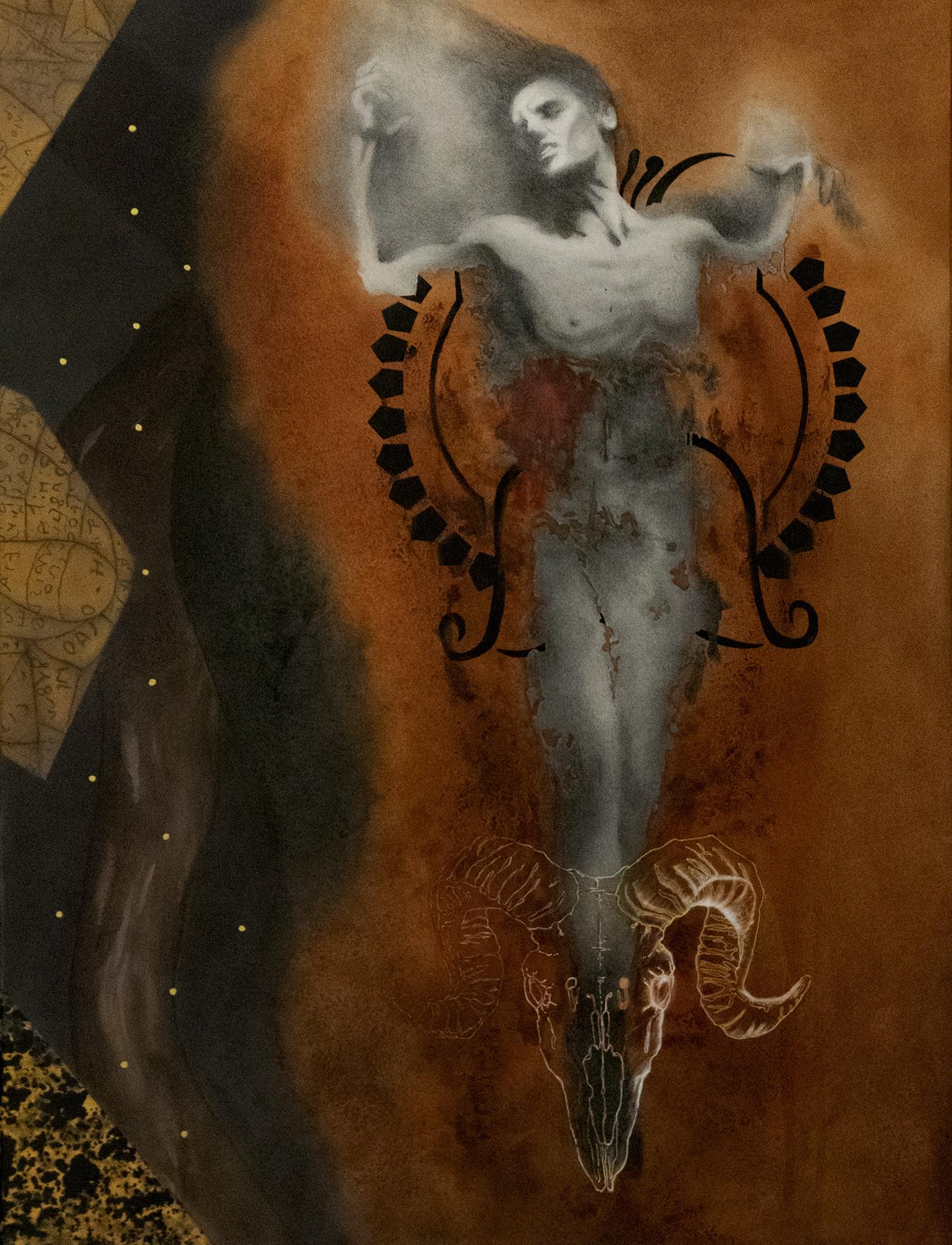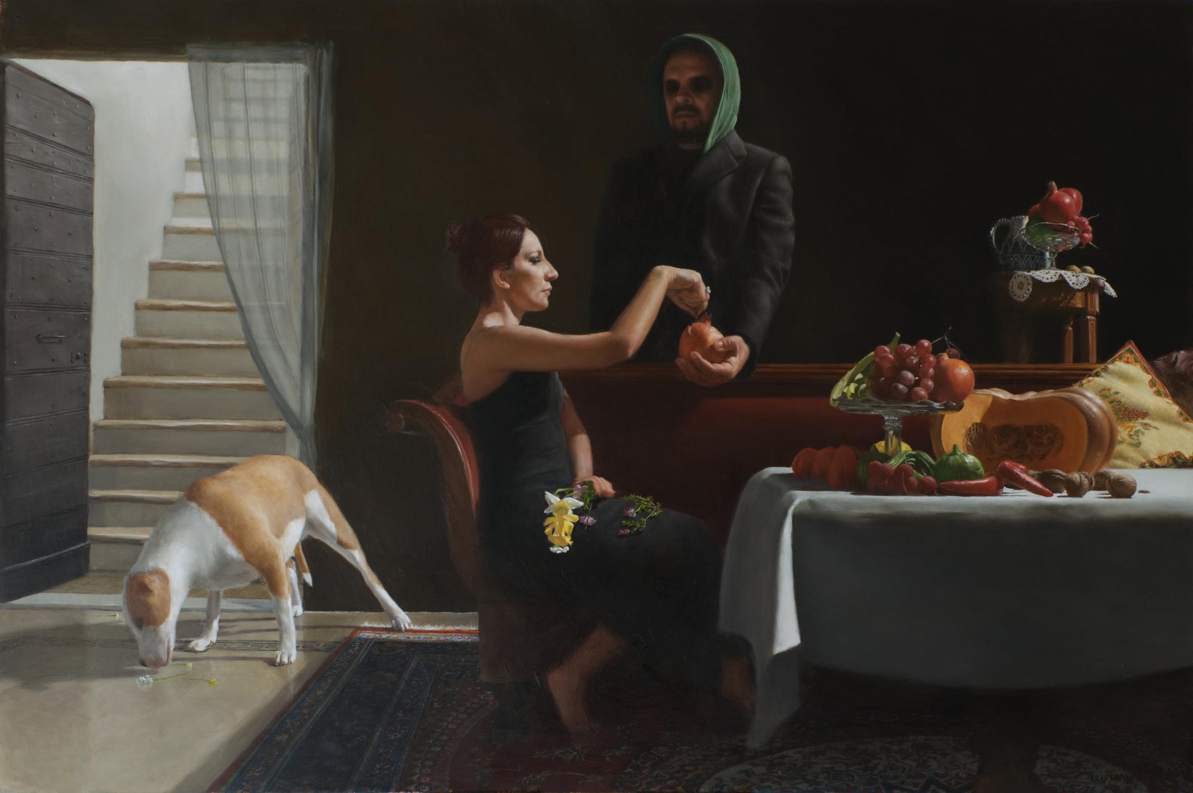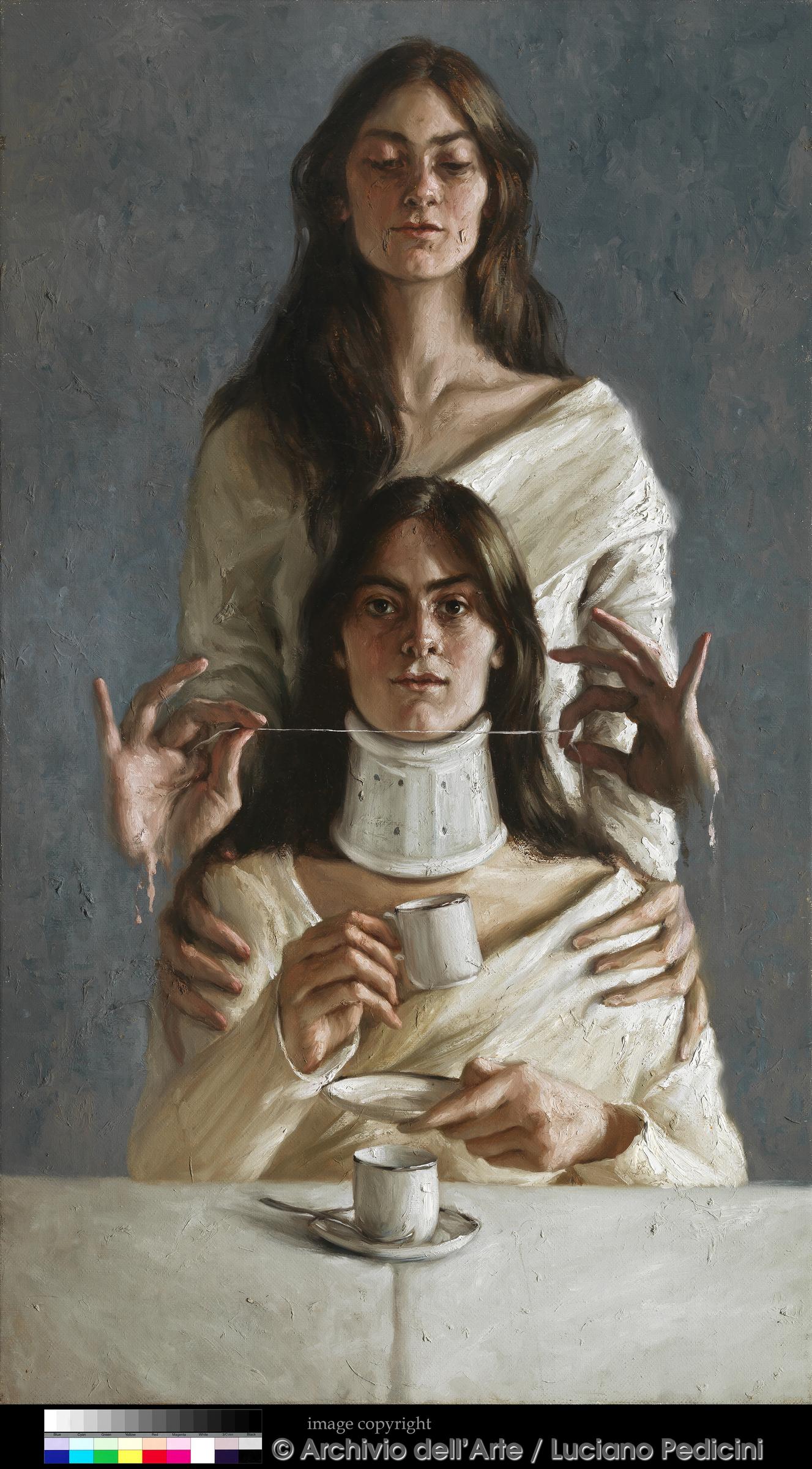 mito rivisitato da Justin Bradshaw e da Anastasya Voskoboinikova, della divinazione ripensata da Bianca Maria Scrugli e della storia d’amore narrata da Alessandra Rovelli. E la rappresentazione dell’amore torna nei due omaggi al Sarcofago degli sposi: quello pulsante di carne e verità di Riccardo Mannelli e quello malinconico di Massimo Lagrotteria. Il vasellame etrusco diventa spazio della quotidianità contemporanea con Paolo Quaresima e macchina fatata con Alessandra Carloni, mentre il corpo è protagonista del viaggio nel tempo di Giampiero Abate e del poetico trio di Jara Marzulli. Se Alessandro Casetti racconta gli antichi rituali di passaggio attraverso due figure femminili, la donna è vergine e icona nell’opera di Giovanni Gasparro. Opera che è anche ritratto, genere per antonomasia legato all’arte etrusca. Come un ritratto è la Gorgone di Claudia Giraudo, cortocircuito tra l’innocenza dell’infanzia e la mostruosità della figura mitologica. E ritratto è anche So Ham di Giorgio Tentolini, sofisticato gioco neo optical e omaggio, nella deformazione estremizzata, alla statuetta votiva etrusca l’Ombra della sera.