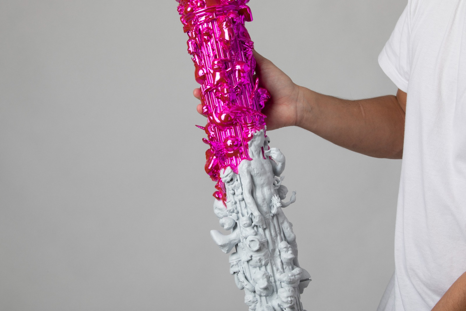 Un visual clash barocco, avulso dai canoni dell’armonia e delle proporzioni, fondato su un’iconografia carica di soluzioni formali ardite che integra ele- menti classici, iconici, e prodotti della società di massa, giocattoli, memes e figure popolari.