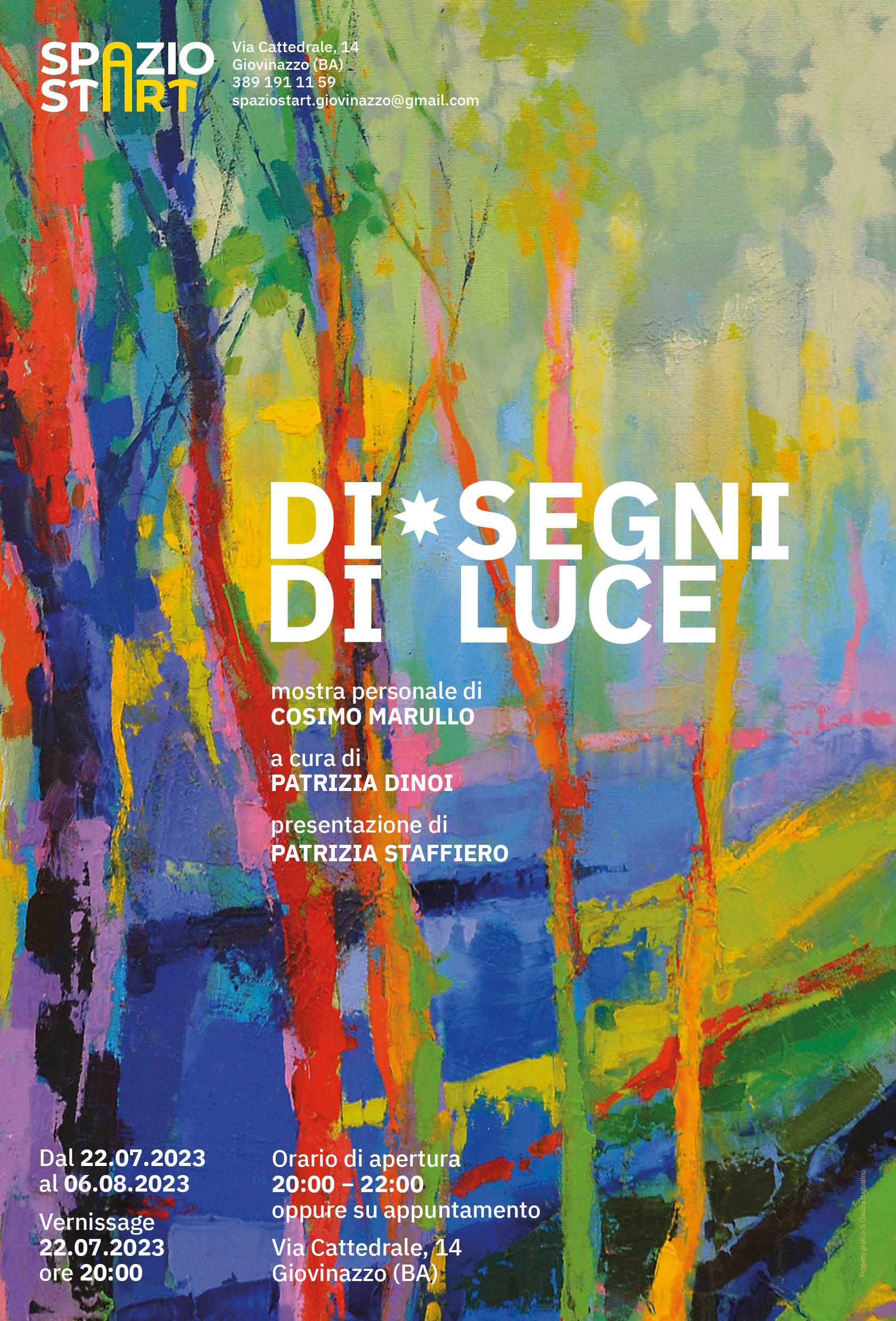 Sabato 22 luglio 2023 alle ore 20:00, presso la suggestiva galleria SPAZIO START nel centro storico di Giovinazzo (via Cattedrale n.14), verrà inaugurata la mostra dell’artista Cosimo Marullo dal titolo “Di – Segni di luce” a cura di Patrizia Dinoi. Presenterà la mostra il critico prof.ssa Patrizia Staffiero. La mostra è visitabile fino al 6 agosto 2023, con orario di apertura 20:00 – 22:00, oppure su appuntamento (tel. 389 191 1159).