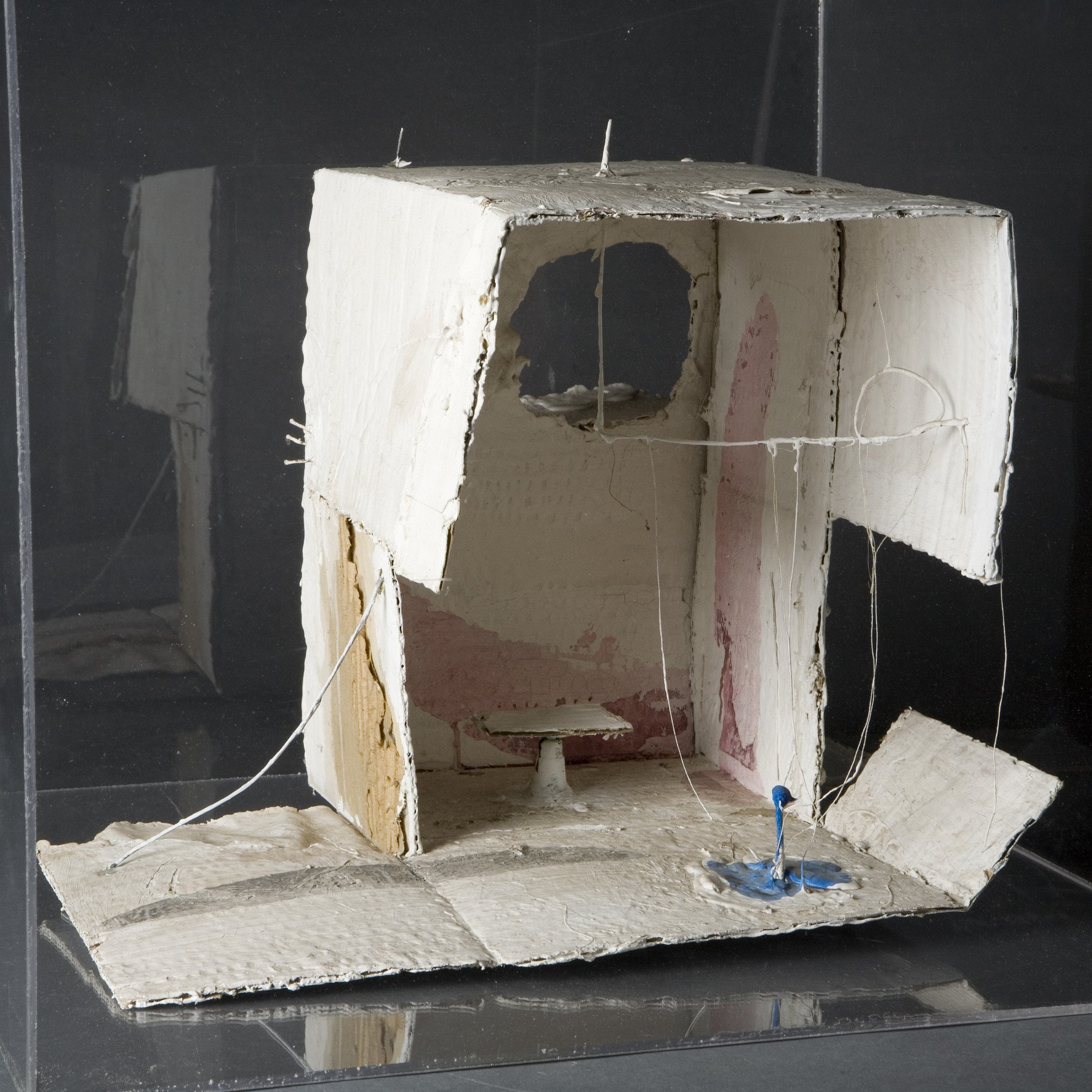 Ma la formulazione più compiuta dell’innovativa concezione della scultura di Costantino Ruggeri si identifica con “Le celle”, opere tridimensionali in cui l’artista utilizza un cartone spesso piegandolo a forma di parallelepipedo, ricoperto totalmente di uno strato di gesso e pittura bianca, tali da rendere il manufatto immacolato.