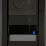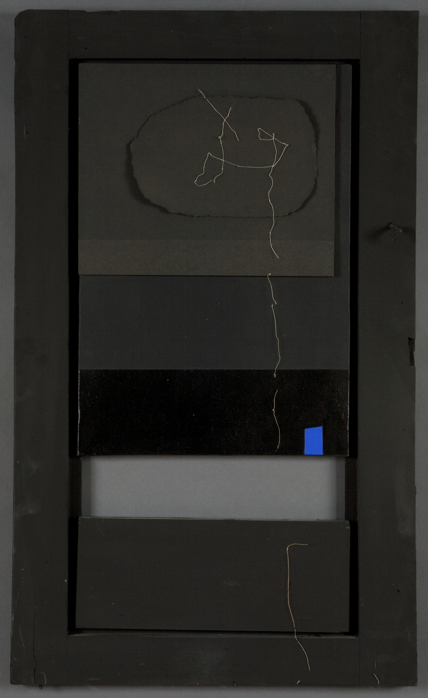 Seguono le Forme Nere, che presentano superfici scandite da larghe campiture materiche, con esiti di grande impatto visivo. Le Forme nere sono più rare e fanno da contraltare al bianco assoluto. In queste opere talvolta compare anche un piccolo spazio colorato, come avviene nella splendida Forma Nera scandita da cartoni di riuso che, sovrapposti e ritagliati, definiscono lo spazio secondo forme geometriche, all’interno delle quali si muove un filo di refe bianco increspato come una ragnatela precaria.