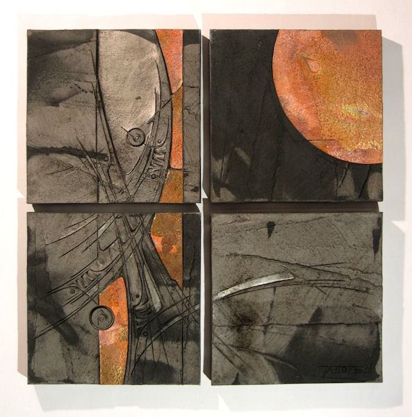 Ma, se ci soffermiamo a riflettere sui principi operativi adottati da Michelangelo Tallone, sulle sue ricerche estetiche, sostanziate dalle potenzialità materiche del bucchero, oggi, non possiamo che cogliere un primo livello di segrete analogie, a partire dalle sue sperimentazioni sulla ricchezza della gamma cromatica ottenibile, che va dal nero alle tonalità dell’argento. Il suo passo successivo e anzi strettamente complementare, dipende dalla volontà di sottoporre quella specifica materia ceramica all’indagine sulle sue potenzialità poetico-espressive, che anche in questo caso sono sospinte, ben oltre i limiti della figurazione tradizionale, entro l’orizzonte di un personalissimo repertorio di significazione materico-segnica.