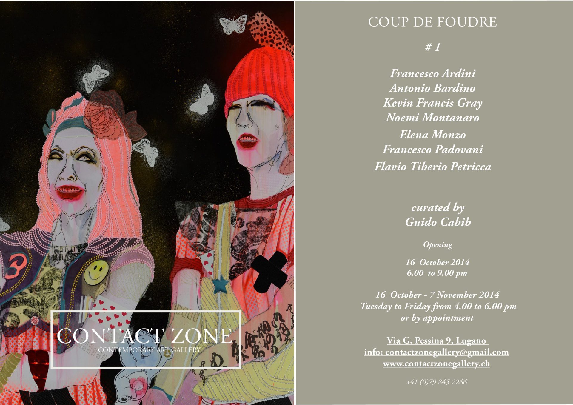 Contact Zone – Contemporary Art Gallery è lieta di presentare: “COUP DE FOUDRE # 1” , group show di Francesco Ardini, Antonio Bardino, Kevin Francis Gray, Noemi Montanaro, Elena Monzo, Francesco Padovani, Flavio Tiberio Petricca, a Lugano, a cura di Guido Cabib. Opening 16 Ottobre 2014 ore 18.00