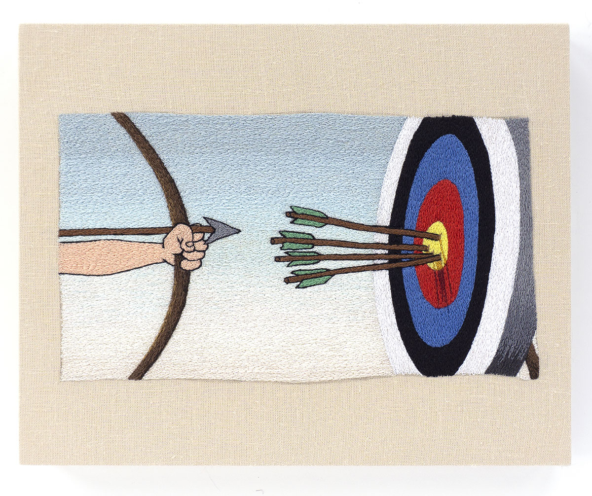 “Vigliacco!” è una raccolta di diciannove nuovi lavori realizzati nel 2022, ricami e ricami su tessitura jacquard.