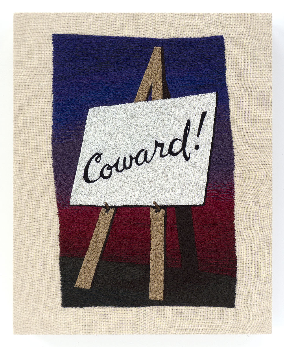 "Vigliacco!" è una raccolta di diciannove nuovi lavori realizzati nel 2022, ricami e ricami su tessitura jacquard, esplorando la mia vigliaccheria. Riguardano la paura di perdere. Si tratta di trovare scorciatoie e prenderle. Riguardano il lasciare le cose incompiute nel tentativo di evitare ogni finalità. Si tratta di preoccuparsi al punto da annodarsi.