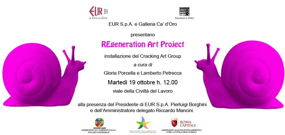 Galleria Ca’ D’Oro ed EUR S.p.A., dopo il successo di “Awakening” (“Risveglio”, opera di Seward Johnson posizionata sotto l’obelisco di piazza Guglielmo Marconi), tornano a collaborare e scelgono il Palazzo della Civiltà del Lavoro come nuovo luogo-simbolo dell’incontro tra Roma e l’arte contemporanea. Ai piedi dell’edificio emblema dell’Eur e dell’anima moderna della città, Gloria Porcella e Lamberto Petrecca hanno curato l’installazione di Pink Snails, 5 grandi chiocciole fucsia in plastica riciclabile firmate dal Cracking Art Group e inserite nel Progetto REgeneration.
