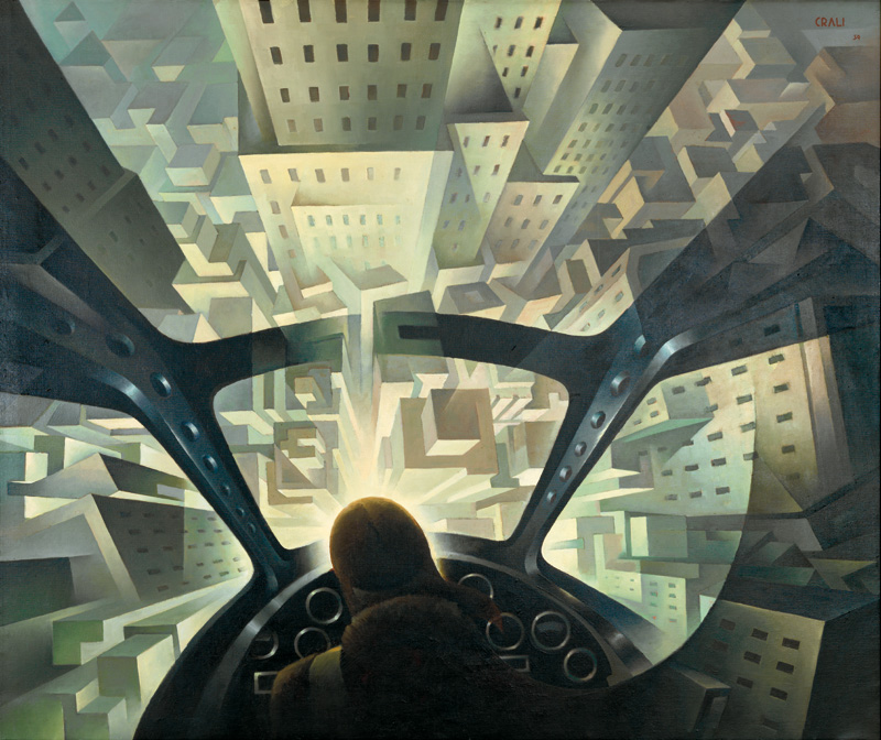 Compongono questa esposizione una serie di aeropitture e altri dipinti a soggetto futurista, uniti a bassorilievi, polimaterici e grafiche, tra cui uno dei capolavori dell’artista e di tutta l’aeropittura italiana, Incuneandosi nell’abitato (In tuffo sulla città) del 1939, che entusiasmò Marinetti a tal punto da giudicare pubblicamente Crali come “il più grande aeropittore italiano”.