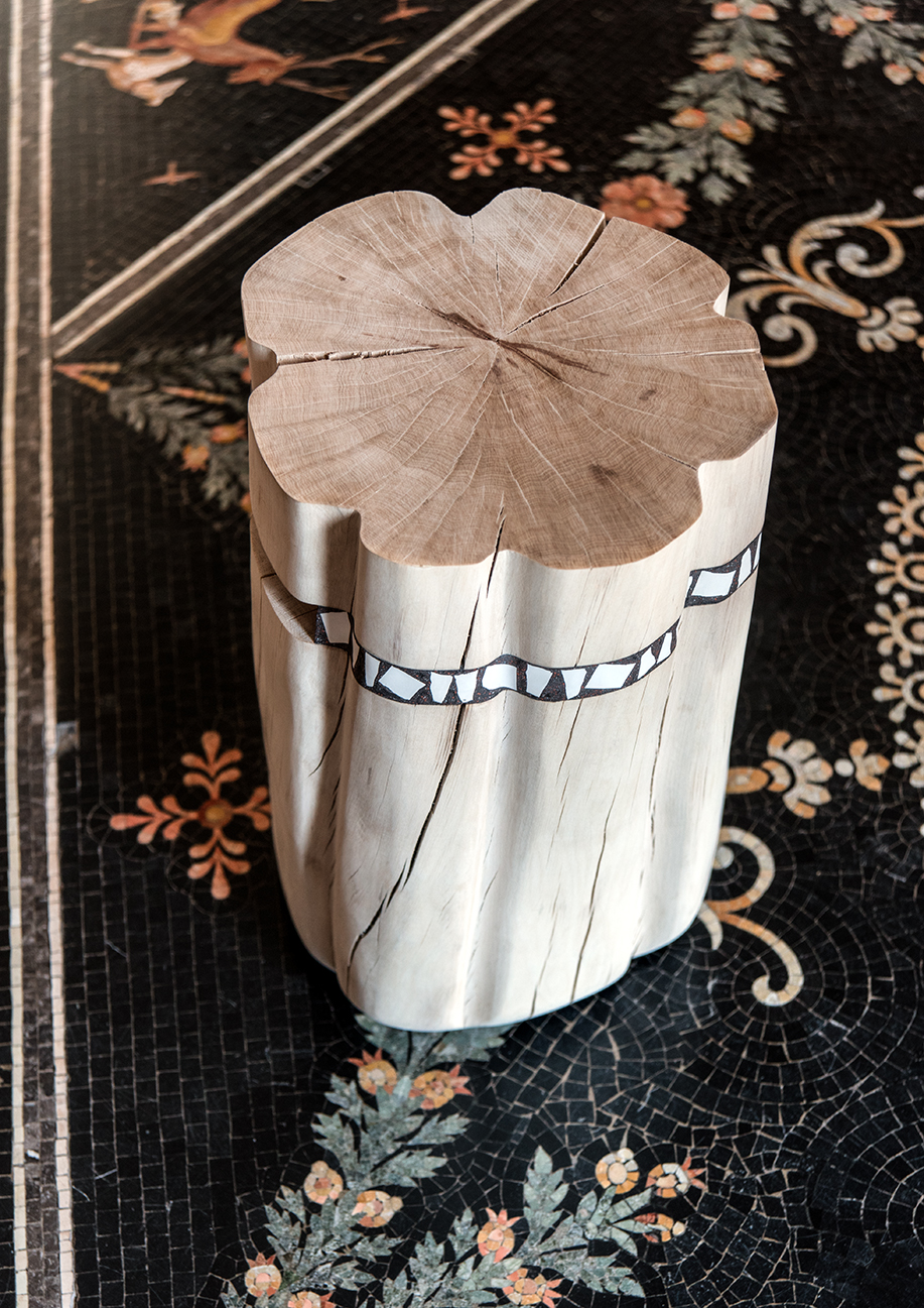 Con la sua proposta musiva estende la poetica di un oggetto ispirato alla natura. Il pouf è un ceppo lavato e levigato, solcato da lisce crepe. Come dice Guerra Sobejano, “ricorda gli alberi pietrificati che riposano sui sassi del Tagliamento”. Ispirato dalla sua personale esperienza di camminate lungo i fiumi, il mosaicista spagnolo ha fondato l’intervento sull’idea di un’essenziale linea che attraversa la seduta Gervasoni solcandola. In quel solco - che ricorda le crepe nei vecchi legni, così come le venature dei sassi - inserisce l’intervento musivo in argilla bianca cotta, che bene si fonde con il legno chiaro. Come fossero sassi rimasti incastrati nel rotolamento dell’albero in acqua, le tessere musive amplificano la dedizione alla natura che connota il complemento d’arredo prescelto.