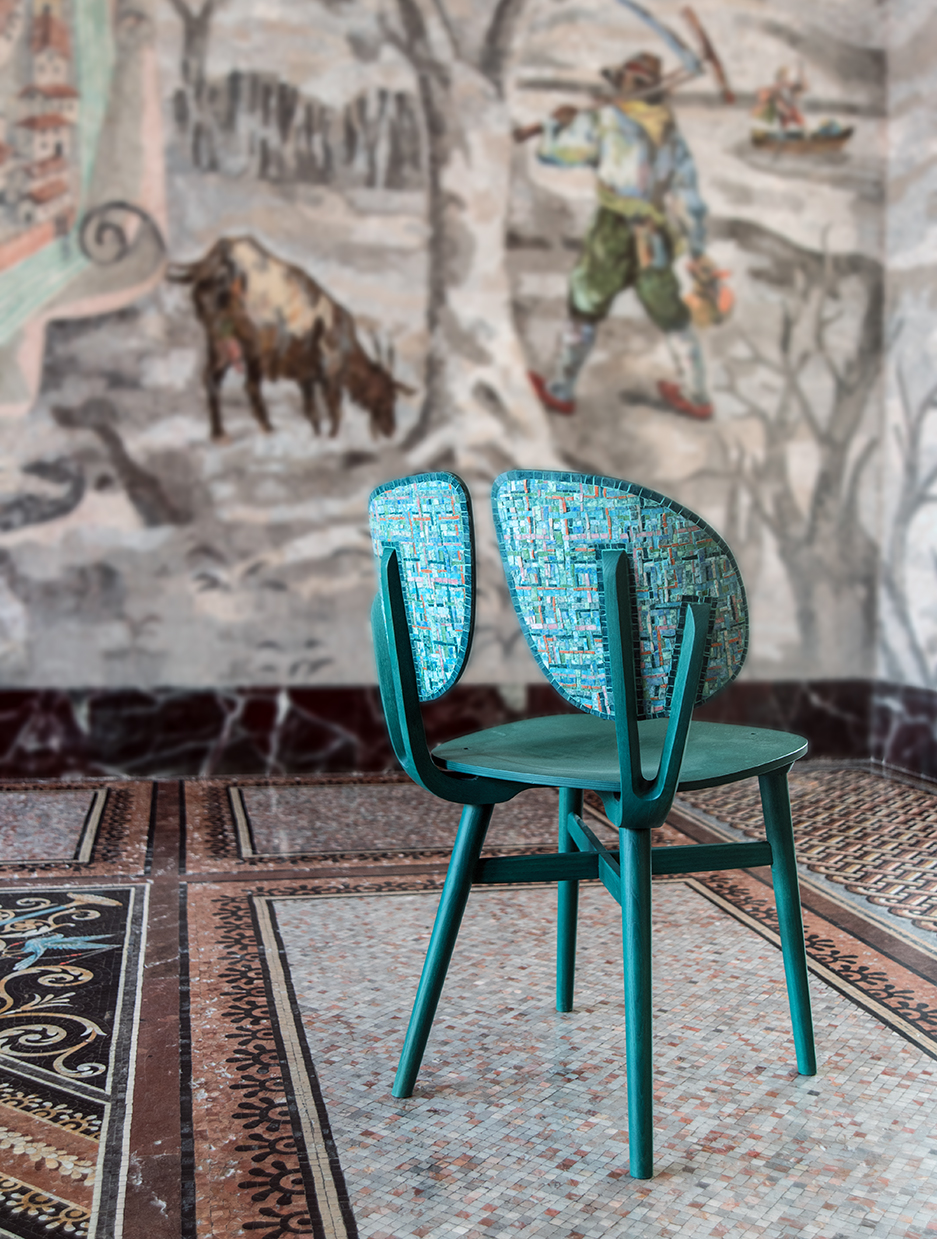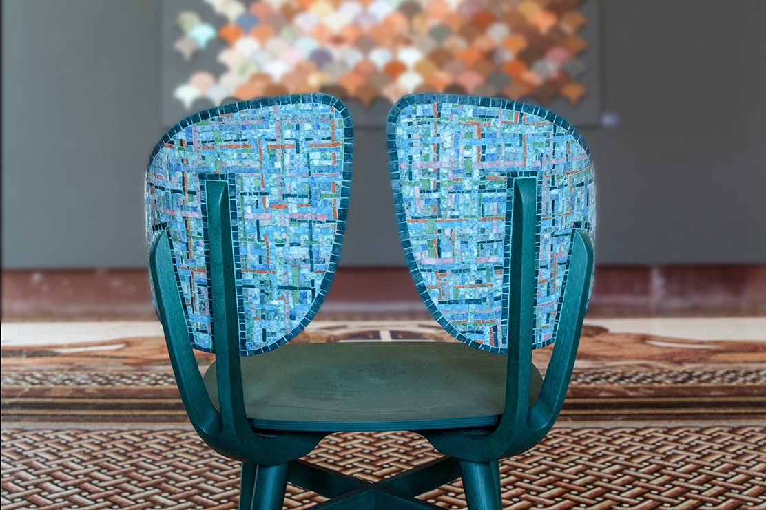 Con un intervento musivo sul retro dello schienale, dichiarando una scelta che promuove un punto di vista insolito sull’oggetto, enfatizza lo sguardo a 360 gradi sull’oggetto. Ispirandosi all’imbottitura della seduta e alla trama dei tessuti, l’intervento musivo propone un intreccio che solo di primo acchito riflette la trama tessile, per poi denotare lo scarto con la trama musiva, personalizzata dalla varietà formale delle tessere e da un andamento più informale e fluido.