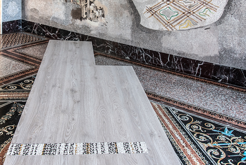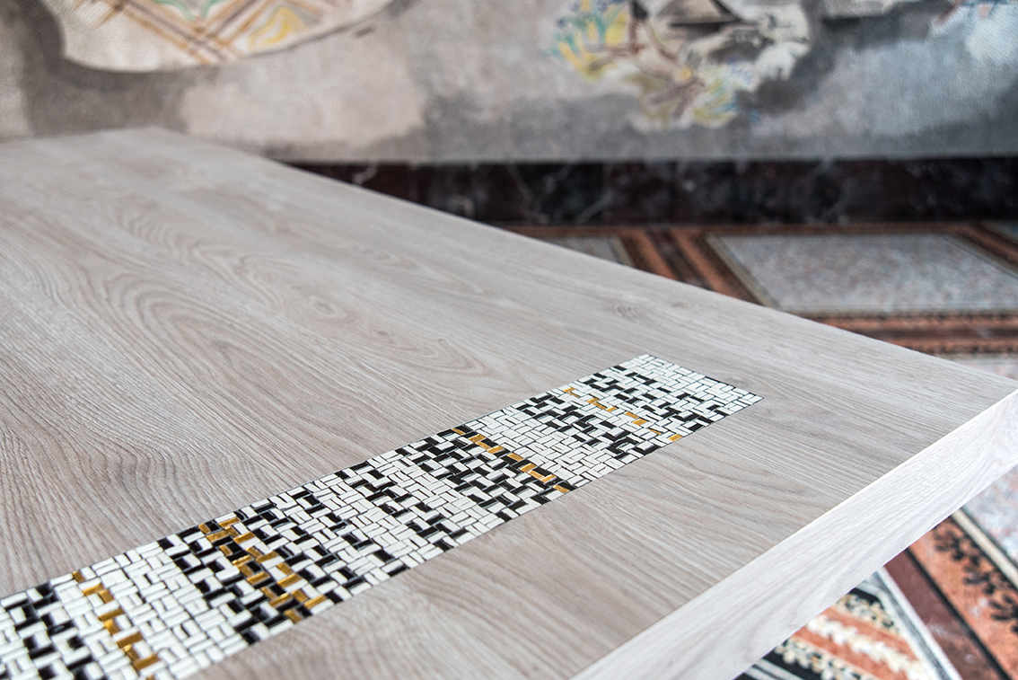 Proponendo l’inserimento musivo in una fascia lineare incava, estesa dal piano anche allo spessore del tavolo, sottolinea da un lato il minimalismo dell’oggetto di design e dall’altro suggerisce un colto apporto culturale nel dialogo fra passato e presente. Immaginando che questo complemento d’arredo contemporaneo fosse stato “scavato”, Tagliapietra inscena l’idea del ritrovamento archeologico: una composizione musiva ispirata alle antiche pavimentazioni romane, facendo leva su due diversi motivi – uno a canestro e l’altro ispirato all’opus sectile (tecnica che utilizza marmi o paste vitree a intarsio).