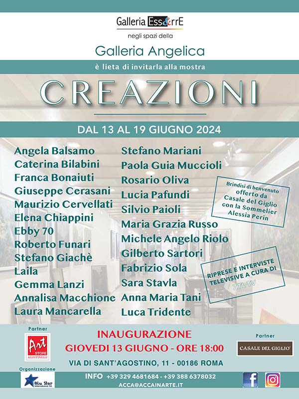 “CREAZIONI” è il titolo della mostra collettiva che verrà inaugurata giovedì 13 Giugno alle ore 18:00 presso la prestigiosa Galleria della Biblioteca Angelica – via di S. Agostino 11- 00186 – Roma.