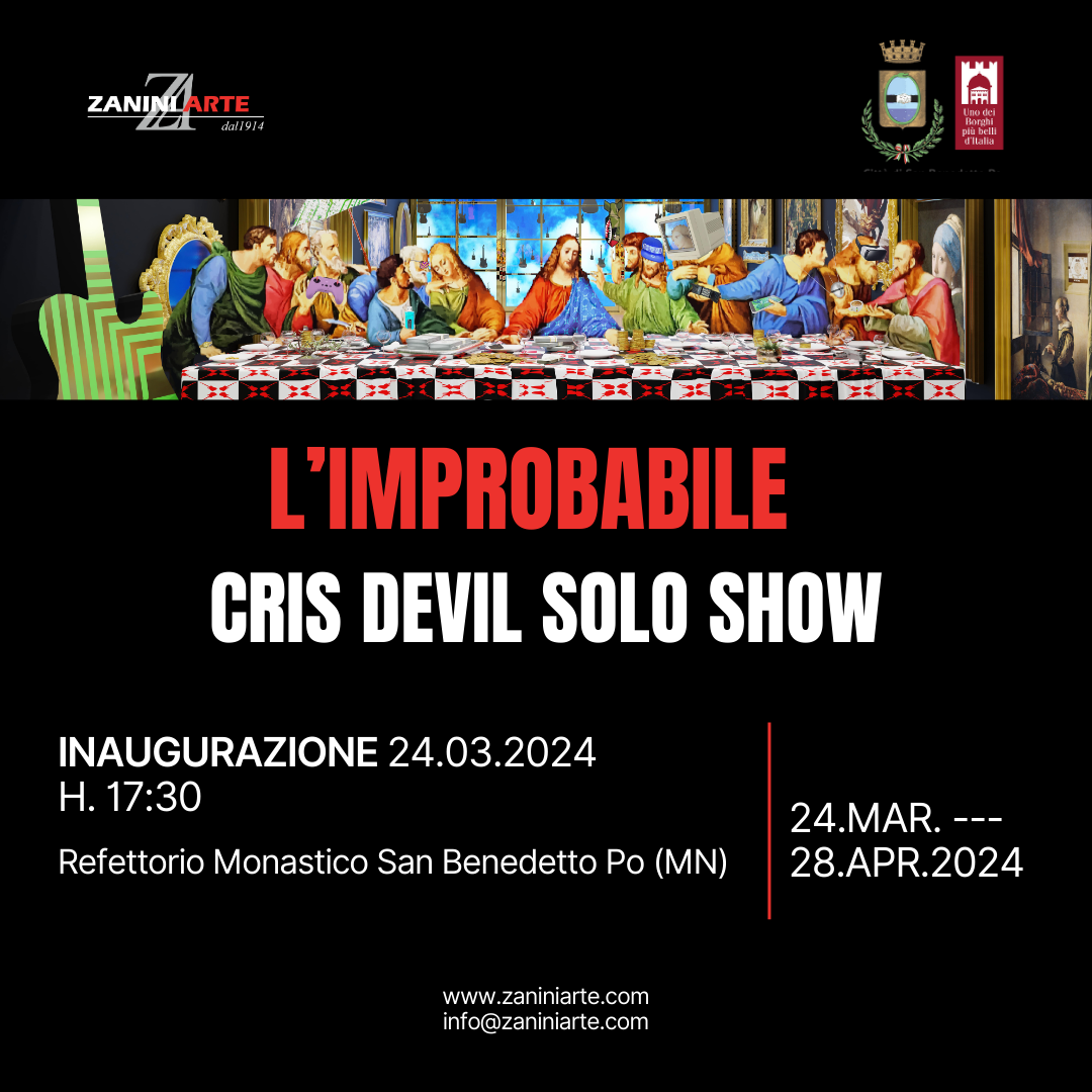 Il Refettorio Monastico di San Benedetto Po (MN) apre le sue porte da domenica 24 marzo alla mostra personale dell’artista Cris Devil “L’improbabile” a cura della Zanini Arte, con il Patrocinio della Città. Il vernissage, con la presentazione critica di Sandie Zanini, si terrà dalle ore 17.30 alla presenza dell’artista.