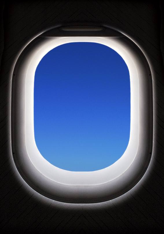 Sono gli scali degli aeroporti, snodi focali dell’esistenza sempre più interconnessa col mondo delle grandi distanze, dove spazio e tempo convivono, nel bene e nel male, con i nostri ritmi interiori. Ma se per Bauman la vacuità del luogo è negli occhi di chi guarda, allora (forse) l’uso e l’abuso del concetto di non-luogo di Augré può essere finalmente ridefinito e reinterpretato. I tagli a fuoco unico degli interni appaiono come quinte silenziose; l’uomo è assente, siamo noi sempre i primi ad attraversarle affascinati come i primi pittori del ‘400, scopriamo la prospettiva e la inseguiamo gettando il tempo dietro al tempo (come scrisse Vasari per l’ingegnoso Paolo Uccello) oppure decidiamo di fermarci sulla soglia, come fa l’artista quando posiziona il suo cavalletto, per limitarci a contemplare scoprendo il valore metafisico nascosto agli occhi di chi procede distrattamente: quel senso di immobile ed eterno che la geometria restituisce attraverso l’architettura. Queste strutture avveniristiche che, nella raffinata pulizia formale, ricordano certi lavori di Werner Mantz e nell’enfasi della luce la grandezza di Karl Hugo Schmölz, precedono l’abisso del blu percepito in volo. La serie degli oblò circoscrive porzioni di cielo come le cornici che separano la realtà fenomenica dallo spazio dipinto. Una finestra che getta lo sguardo verso il mondo per distaccarsi dalla realtà e acquistare una straordinaria palpitazione di ideale (Ortega Y Gasset, Meditazioni sulla cornice). Momenti preziosi d’infinita solitudine ma essenziali per assaporare il senso di libertà. Finestre aperte verso il vuoto o chiuse in spazi ovattati come nella fiumana in blu. Quasi un omaggio alla fotografia soggettiva di Peter Keetman: il frastuono e la calca del pubblico al concerto si condensa sul sottile vetro dell’io, una miriade di gocce sulla pellicola.