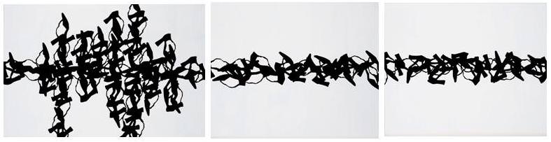 Con il nuovo lavoro Cristiana è come se avesse acquisito una diversa consapevolezza, un nuovo punto di vista, come se avesse individuato l’esistenza di una direzione, come se stesse cominciando a guadagnare terreno, come se cominciasse a posare i piedi per terra … Così, le scarpe non sono più oggetto-soggetto, ma strumento e si ripetono, riempiendo la tela, diventando lettere di un alfabeto che, naturalmente, continua a parlare al femminile: la matita traccia sagome che si sovrappongono, si intersecano, si susseguono, sono tante e sembrano debordare confondendo contenuti e parole, ma si compongono invece in un’intima struttura che crea il percorso che Cristiana ha oggi in corso. I Cumuli, Il Naufragio, Sismografia del desiderio, parlano di un sommerso che oggi intraprende una strada di cui è anche possibile non vedere a breve la meta finale, ma che mostra che Cristiana ha forse “sciolto” quei lacci che stringono in Energia costretta e in Svincoli e comincia a percorrere caparbiamente e con forte determinazione un nuovo, proprio cammino. Le linee di confine non chiudono, non possono “imprigionare” e l’alfabeto di Cristiana deborda, smargina, riempiendo tele che non sono più bianche e immacolate, ma alte e spesse tele di iuta, il vacuo contesto e la sospensione sono temi scomparsi e la tela è piena, oltre le Linee di confine, e non basta a contenere tutte le lettere del suo alfabeto. Forse che Cristiana abbia trovato le fila di quelle trame perdute di cui parlava Elio Mercuri nel 2010 ?