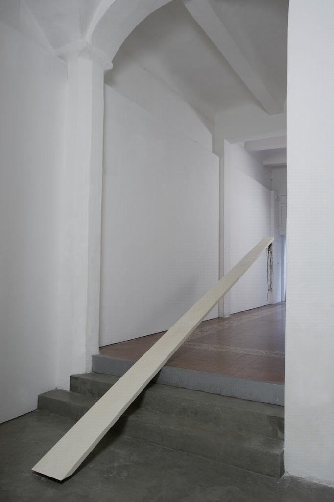 la mostra apre alla forma e alla sostanza poetica di questa giovane artista. Le opere riflettono inquietudine, disordine, metamorfosi, attraverso l’uso di materiali organici. Come nell’opera Zero (2008): un asse di legno lunga 6,5 metri posizionata in modo irreale tale da sconfiggere le leggi della dinamica, che termina con una scultura fatta di ossa, capelli e garze mediche