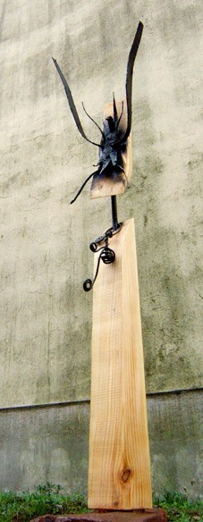 L’assemblaggio di materiali diversi nella stessa opera, accostando il ferro al legno, alla terracotta, alla pietra era tipico anche di un altro grande scultore, il milanese Giancarlo Sangregorio, da cui il giovane sepriese sembra assumere il valore intrinseco della creazione dell'opera d'arte, il tentativo cioè di andare “oltre” la materia: spaccare la pietra per andare “oltre” la pietra, così come bruciare il legno – ed è lo stesso Sangregorio a dircelo – è un gesto animista che restituisce al legno stesso la sua vita segreta e più autentica. L’artista si fa dunque medium del processo di trasformazione della materia ma, come un artigiano antico, non lo determina.