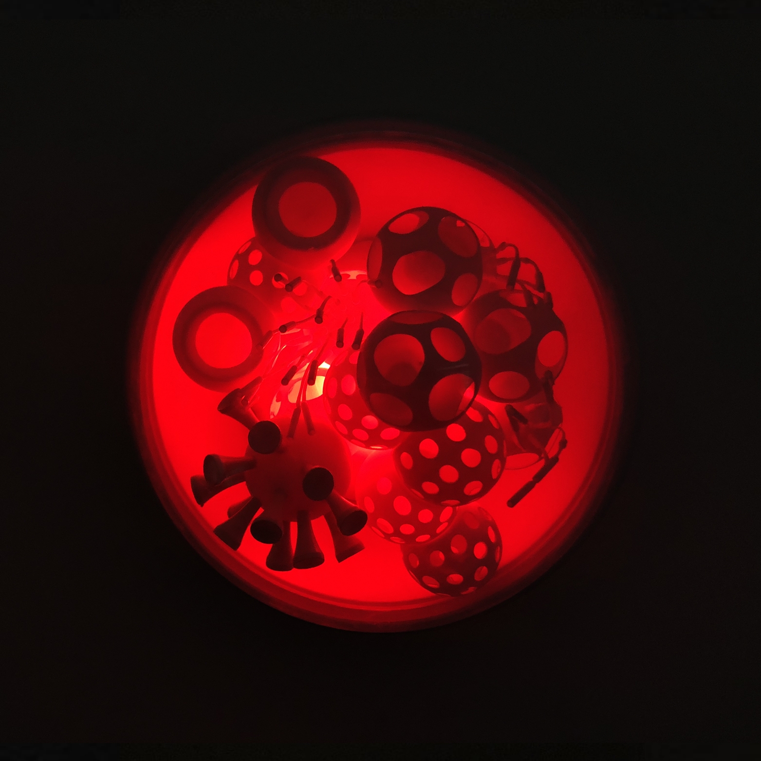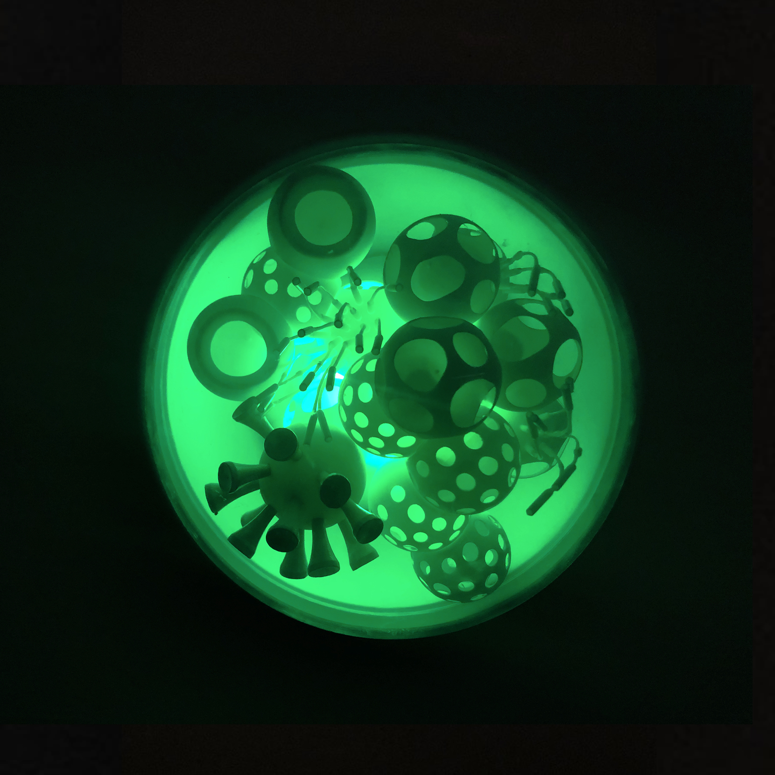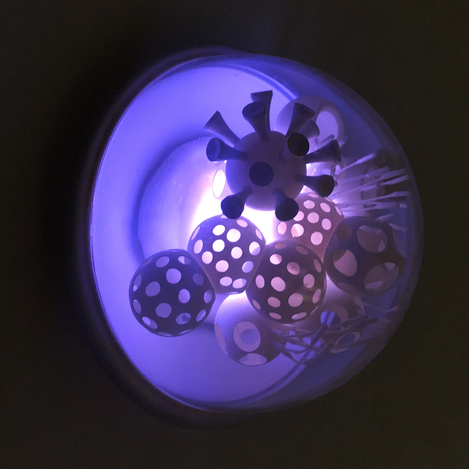 Cristiano Petrucci concepisce così un ampio gruppo di lavori come cellule di un complesso organismo. Ogni opera è costituita da una teca semisferica contenente una composizione che si rifà alla struttura di un virus, dove le variazioni cromatiche delle luci a led amplificano la suggestione percettiva del lento mutamento di una materia viva e dinamica. La modularità esponenziale con cui è stato ideato l'intero lavoro emula l'andamento della diffusione pandemica del virus il quale genera un arcipelago di cellule-virus che simboleggiano la memoria storica di questo difficile momento e la necessità di andare avanti nella costruzione del domani.