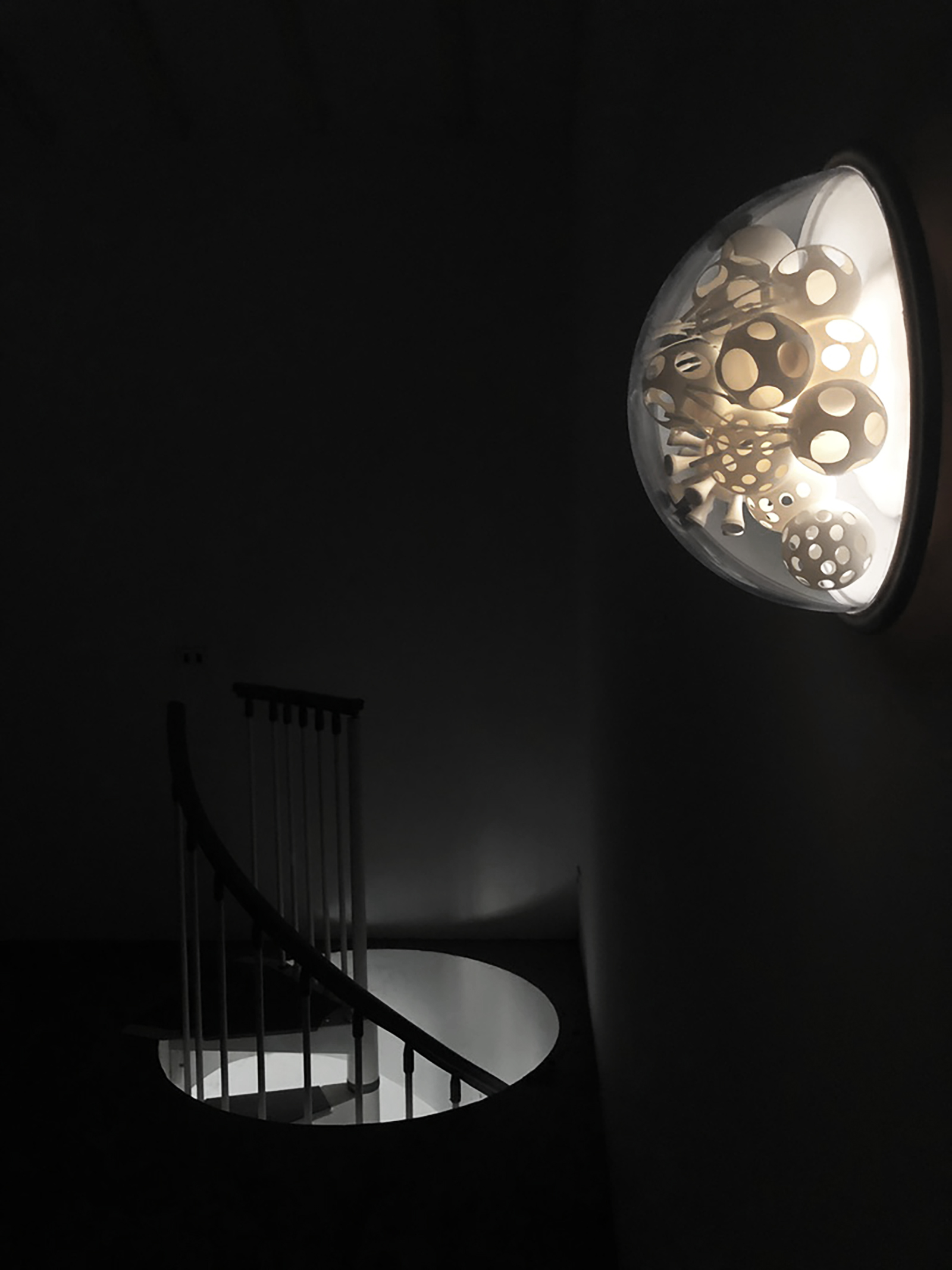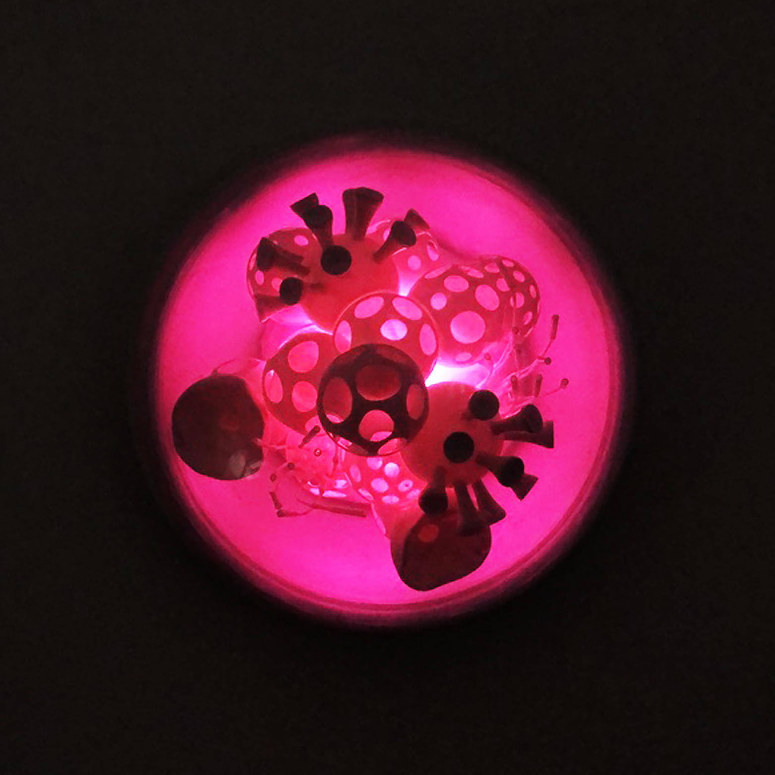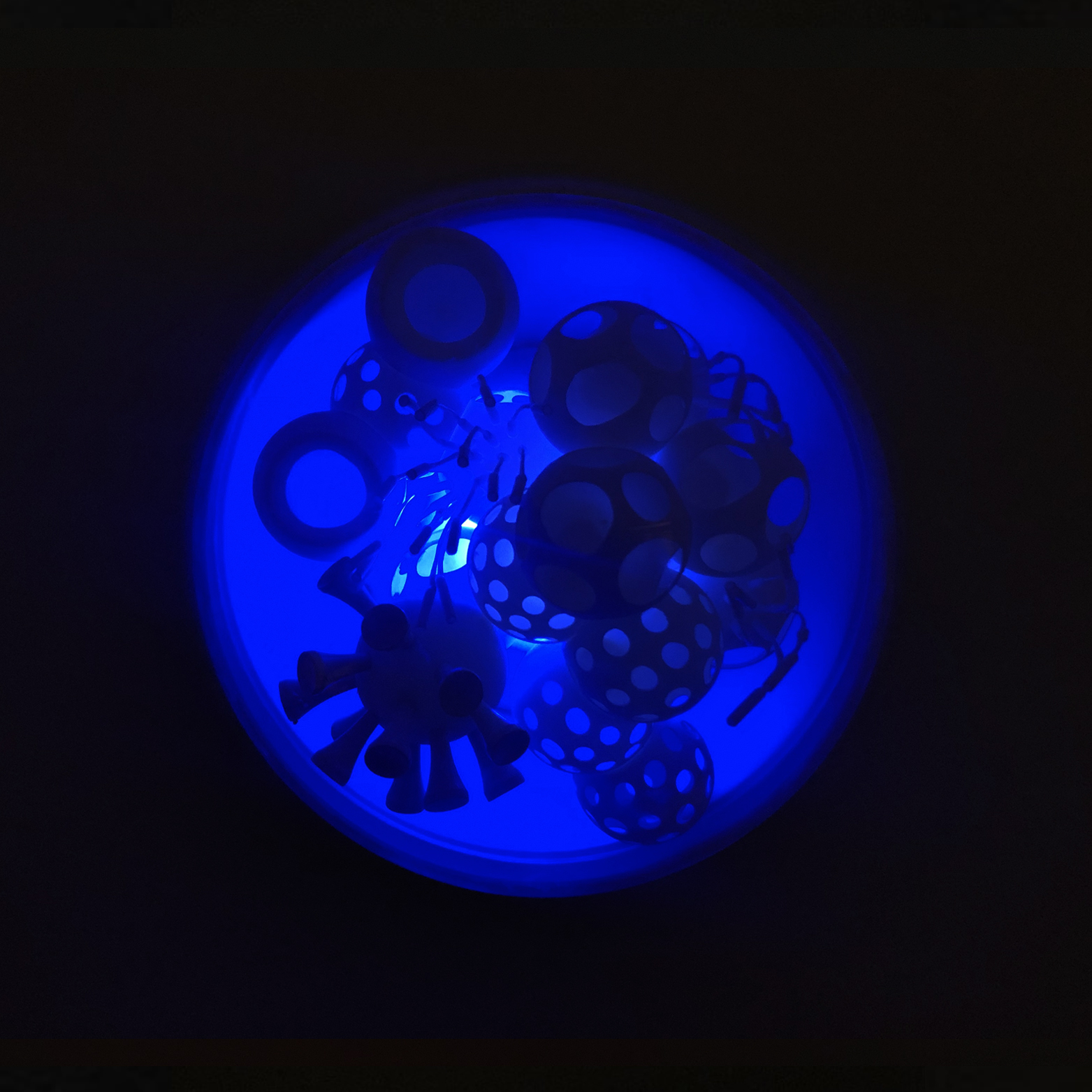 Cristiano Petrucci concepisce così un ampio gruppo di lavori come cellule di un complesso organismo. Ogni opera è costituita da una teca semisferica contenente una composizione che si rifà alla struttura di un virus, dove le variazioni cromatiche delle luci a led amplificano la suggestione percettiva del lento mutamento di una materia viva e dinamica. La modularità esponenziale con cui è stato ideato l'intero lavoro emula l'andamento della diffusione pandemica del virus il quale genera un arcipelago di cellule-virus che simboleggiano la memoria storica di questo difficile momento e la necessità di andare avanti nella costruzione del domani.