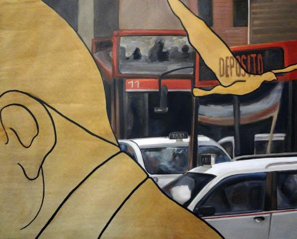 Al centro della scena di Cristina Caimi un paesaggio urbano fatto di piazze e strade, dove la folla umana cerca di farsi spazio tra traffico, lavori in corso, cartelli stradali e pubblicitari.