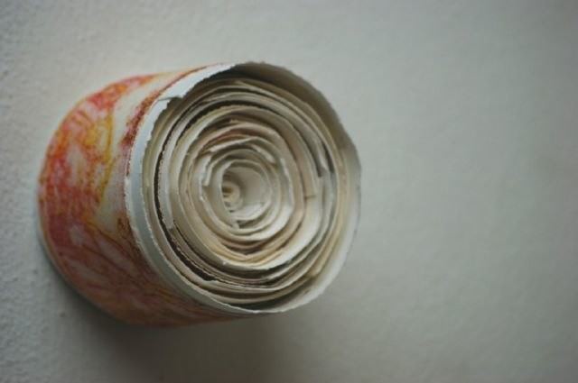 Ho ridotto queste carte in linee di poco spessore, ogni foglio strappato, ripiegato, attaccando poi una striscia all’altra resa quindi come unica striscia temporale arrotolandola su se stessa a spirale. Operazione infinita: tagliare, strappare, unire, incollare, arrotolare ossessivamente, come per trovare, nel tempo, un senso attraverso il mio operato ossessivo.