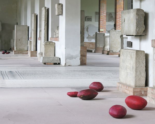 Cristina Treppo lavora da sempre con un pensiero site specific. La maggior parte delle opere esposte in Residui sono state realizzate appositamente per la mostra. Non si tratta solo di un adattamento dei propri lavori alle sale del museo, ma di un dialogo tra artista da una parte e spazio e resti archeologici dall’altra. In alcuni casi è stato proprio il museo stesso a sollecitare il percorso creativo di alcune opere, come i grandi semi che sono collocati nel chiostro, il busto in gesso e la struttura architettonica di cemento e vetro.