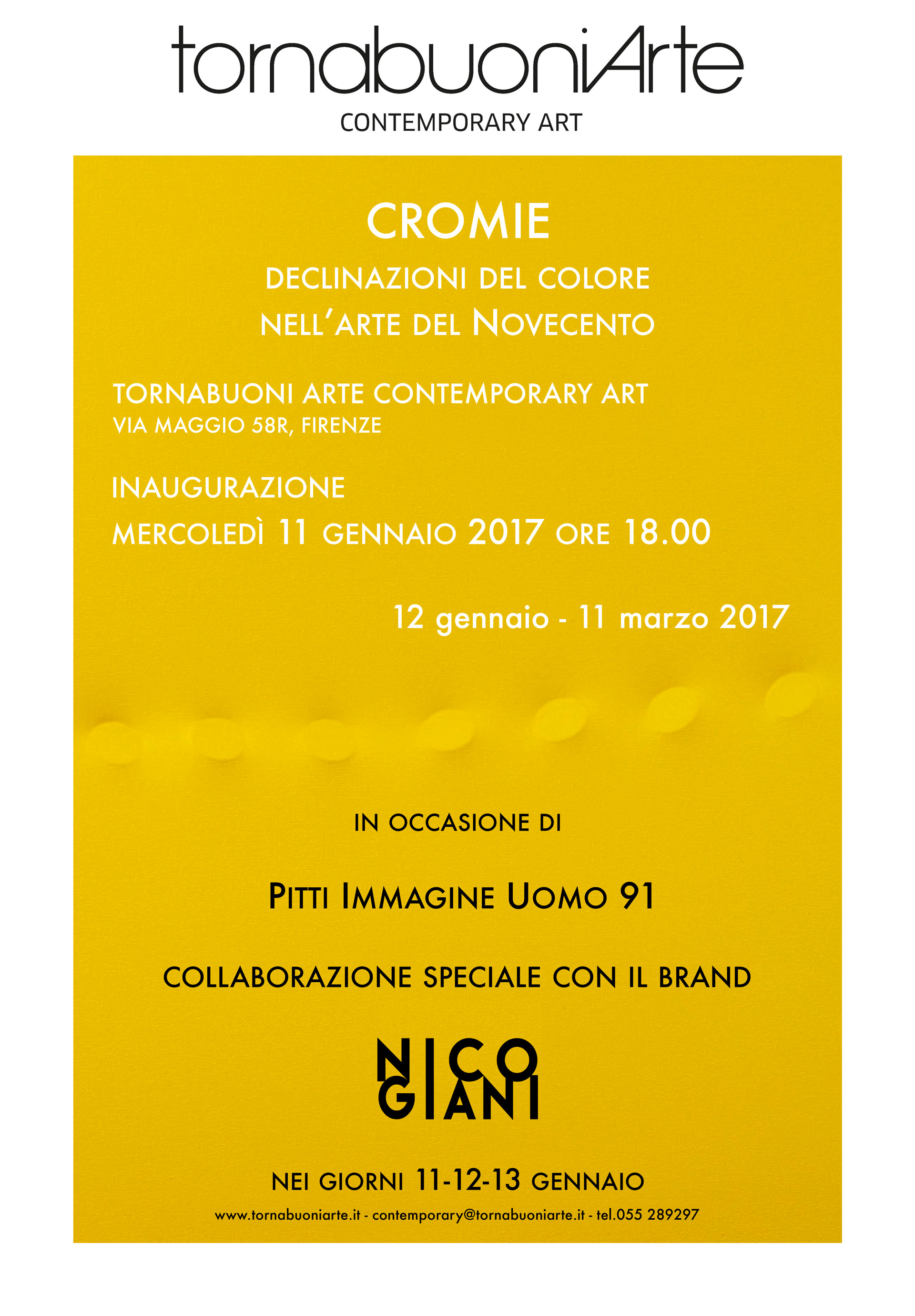 Mercoledì 11 gennaio alle ore 18.30 sarà inaugurata la mostra “CROMIE, declinazioni del colore nell’arte del Novecento”, presso la Tornabuoni Arte Contemporary Art in via Maggio 58/r a Firenze. L’evento rientra negli appuntamenti di Pitti Immagine Uomo 2017, per questa occasione fino al 13 gennaio sarà visibile in galleria un allestimento che unisce l’estetica dell’arte a quella della moda, per mezzo di installazioni site-specific che pongono in relazione i quadri con le borse del brand Nico Giani.
