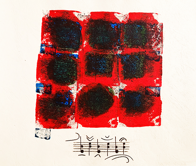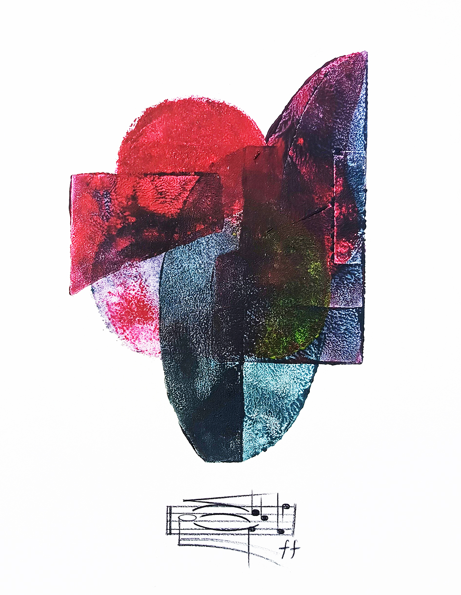 Michele Ferri in “Cromosuoni” utilizza la matericità non dipinta dei colori attraverso la stampa manuale di forme per ottenere immagini le cui tonalità si sovrappongono e le forme geometriche diventano, allo stesso tempo, timbro cromatico e sonorità visiva.