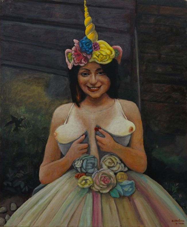 Tutto si palesa allora tra le tessiture del sogno e lo spazio della realtà, in opere dove l’eros, con raffinata sfrontatezza, smuove i blocchi culturali e le usanze, motore delle cose di un mondo dominato da quelle convenzioni che vengono sfidate dallo sguardo corrosivo del pittore.