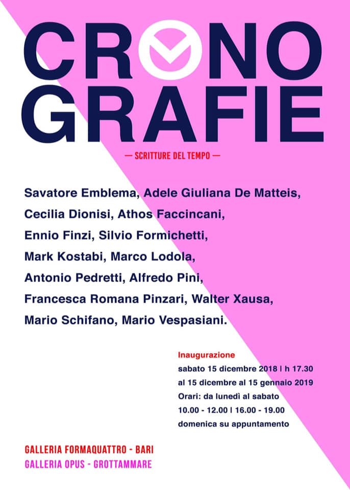 L’associazione culturale Rosa dei Venti, in collaborazione con la Galleria FormaQuattro di Bari e la Galleria Opus di Grottammare, ha il piacere di annunciare l’evento Cronografie, scritture del tempo, mostra collettiva che ha come tema principale il tempo e la sua scrittura nell’arte moderna e contemporanea.