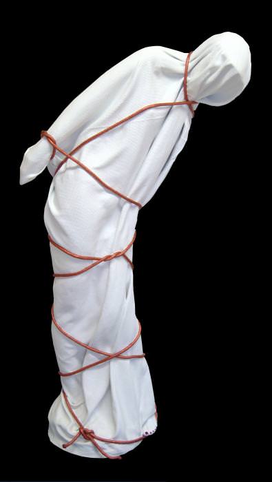 denuncia lo stato della donna oggi con sculture insieme forti e fragili, plasmate col gesso e con la tela.