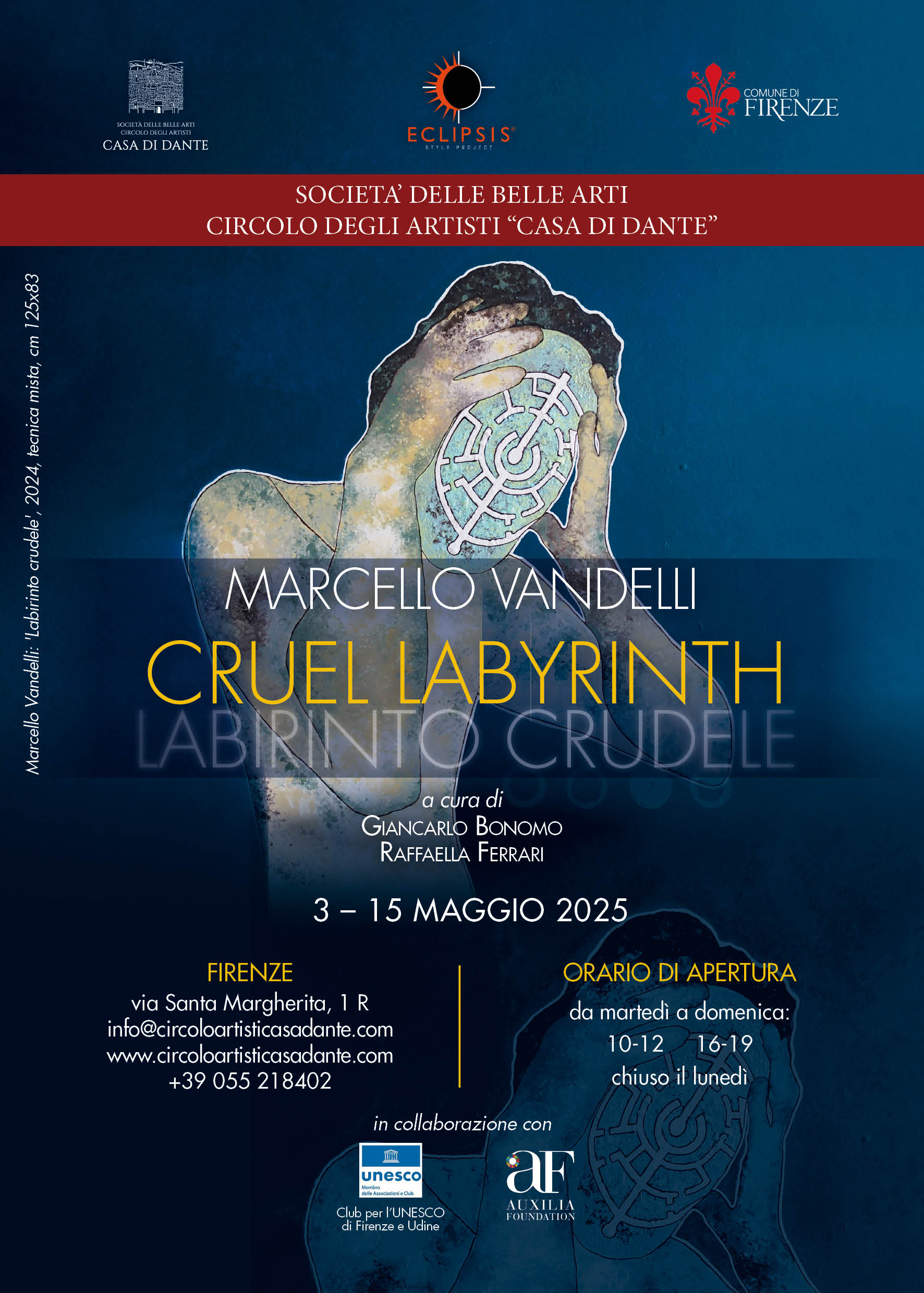 C’è un’energia indomabile nelle opere di Marcello Vandelli, una forza che non si lascia addomesticare e che si manifesta senza filtri, senza compromessi. La sua pittura non è racconto. È vera e propria urgenza in cui non cerca consenso, ma impone la propria presenza con l’irruenza di un linguaggio visivo istintuale, assoluto, e ricco di simboli. Le sue tele non sono semplici quadri, ma campi di battaglia dove il colore esplode in visioni frenetiche, in un continuo duello tra istinto e materia. Nessuna mediazione, nessuna concessione alla misura: la sua arte è un atto di sfida, un manifesto di esistenza bruciante, contemporanea, dove si rende necessario descrivere il proprio tempo senza però dimenticare la preziosità dell’insegnamento del passato. Eccessivo? Sì. Ma il suo non è l’egocentrismo sterile di chi si contempla allo specchio. È un Ego febbrile, quello del profeta errante, del predicatore dell’immagine, dell’alchimista che crede di poter trasformare il colore in rivelazione. Non cerca un dialogo, ma impone un monologo incendiario, in cui ogni pennellata è un atto di autoaffermazione. La sua pittura non vuole piacere, non si modella sulle aspettative, non offre chiavi di lettura preconfezionate. È un codice caotico, da assorbire con la stessa intensità con cui è stato concepito. Un caos volontario, un cortocircuito tra spiritualità e materialismo, tra visione e provocazione. Ma l’arte, per Vandelli, non è solo esplosione: è anche prigione, ossessione, dipendenza. Non un rifugio, ma una trappola dorata che seduce e tormenta. La creatività è un labirinto crudele: si entra per scelta e si rimane per destino. Si può tentare di abbandonare l'arte, ma il richiamo è feroce ed inevitabile; è un canto di sirene che ammalia, avvolge, divora. Ogni distacco è solo una pausa prima di un ritorno ancora più irruento, più affamato, più disperato. Maledetta Arte!! Compagna fedele, incubo e salvezza, dolce-amara condanna. La mostra Cruel Labyrinth, che vede esposti una trentina di quadri presso la storica Società delle Belle Arti - Circolo degli artisti ‘Casa di Dante’ di Firenze, è un viaggio dentro il vortice della creazione, nel paradosso che lega libertà assoluta e prigionia volontaria. Vandelli non cerca vie di fuga, non cerca compromessi. Si tuffa nel labirinto e ci trascina con sé. E allora la vera domanda non è se riusciremo a trovare un’uscita, ma se vorremo davvero cercarla. Così, l'essere eccessivo è la sua forza, il suo non porsi limiti la sua verità. Dipingere per lui è un modo per trasformare l’invisibile, per dare forma al vuoto, cercando nella materia e nel colore una verità che sfugge al linguaggio. E se l’arte deve ancora avere un senso, forse è proprio quello evocato da artisti così: quelli che non chiedono il permesso.