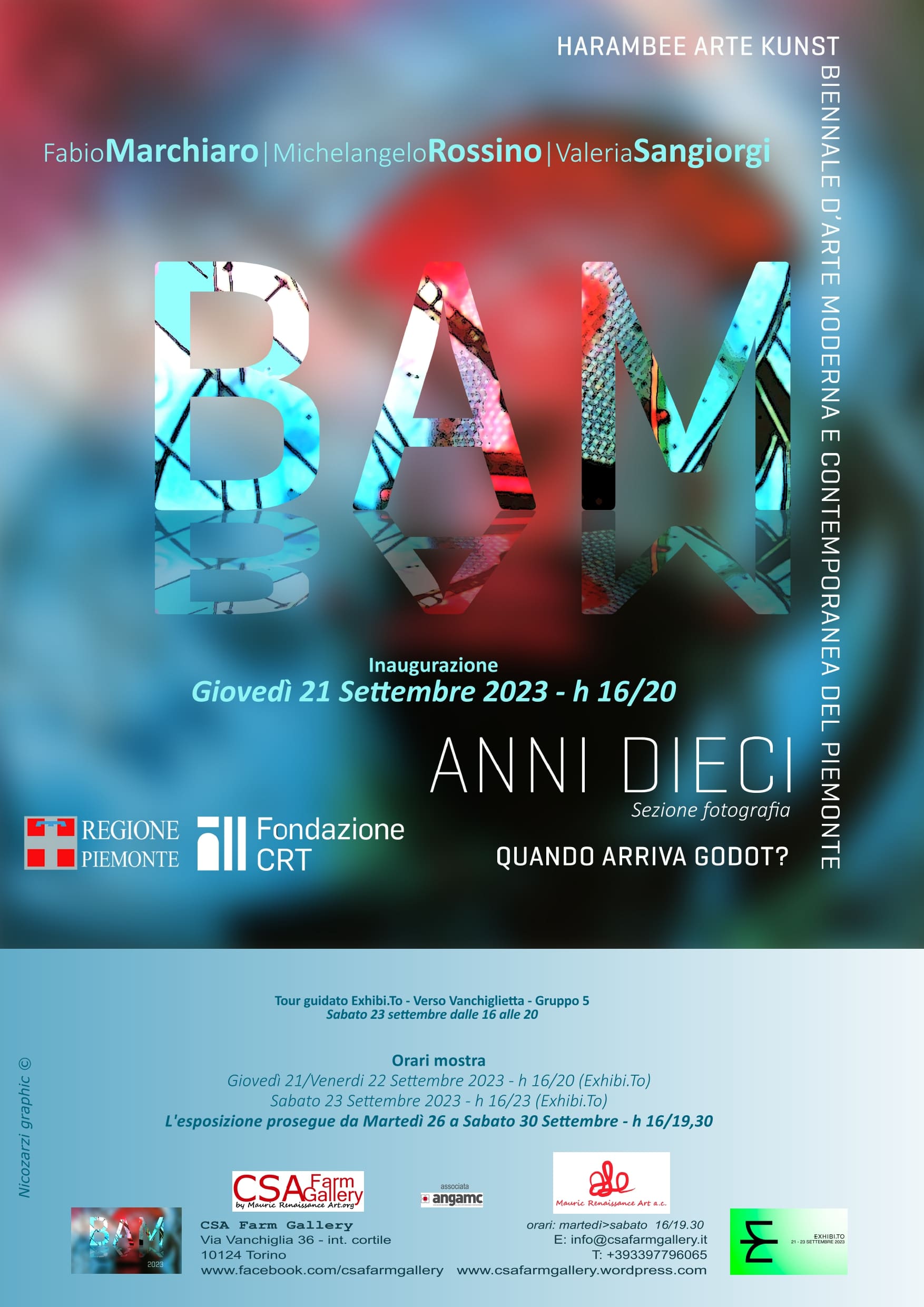 - BAM 2023 (Biennale d’Arte Moderna e Contemporanea del Piemonte 19^ edizione) dal titolo: “Anni Dieci: quando arriva Godot?" - Seconda Sezione dedicata alla Fotografia e Computer Graphic, con le opere di Fabio MARCHIARO, Michelangelo ROSSINO, Valeria SANGIORGI. In collaborazione con l’Associazione HARAMBEE ARTE KUNST (artisti contemporanei associati) di Moncalieri.