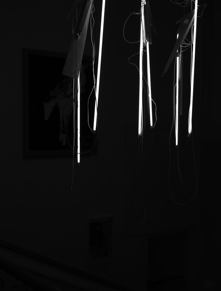 Nel caso di ‘Black Lights’ è importante per noi mantenere un certo equilibrio separando e ri-separando i lavori da altri lavori, così da non alterare il senso e il significato ma creando un’atmosfera di fragilità, temporaneità e provvisorietà ottenuta disseminando le opere all’interno dello spazio.