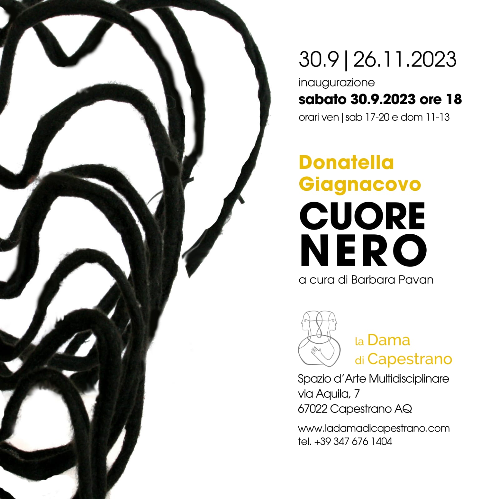 Inaugura sabato 30 settembre 2023, alle ore 18:00, a La dama di Capestrano – Spazio d’Arte Multidisciplinare (via Aquila 7) a Capestrano (AQ), “Cuore Nero”, la mostra personale di Donatella Giagnacovo, a cura di Barbara Pavan.