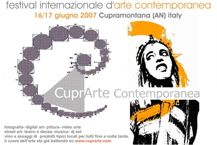 Il cuore dell’arte batte a Cupramontana. Dal 16 al 17 giugno si svolgerà la prima edizione di Cuprarte Contemporanea 2007, il festival internazionale fortemente voluto dall’amministrazione comunale di Cupramontana che ha messo a disposizione spazi, strutture e servizi per la realizzazione del primo festival internazionale d’arte contemporanea dedicato ad artisti, emergenti e affermati, provenienti da tutta Europa. Un festival che raduna circa 80 artisti, critici, curatori, galleristi, stampa e amatori dell’arte. Digital art, pittura, scultura, fotografia, installazioni multimediali, performance e una speciale sezione dedicata alla video arte internazionale. Un appuntamento unico, un’occasione di incontro, scambio, nuove collaborazioni e proposte per artisti affermati e giovani talenti. Una manifestazione che può vedere la luce grazie alla volontà degli organizzatori, con la direzione artistica di William Vecchietti, marketing e comunicazione curati da Caterina Luchetti, la preziosa collaborazione di tutti gli artisti coinvolti, di tutti i volontari appassionati d’arte e dell’intero paese di Cupramontana.