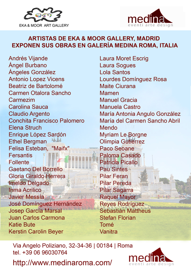 Da Madrid a Roma di Eka & Moor Art Gallery di Madrid dal 3 al 10 Febbraio. Una collettiva di pittori, scultori e fotografi provenienti da diversi Paesi: Argentina, Colombia, Francia, Inghilterra, Italia, Portogallo, Romania, Spagna e Svezia. Una selezione di artisti curata dalla Eka & Moor Art Gallery di Madrid e dal suo direttore Vicente Herrero Heca.
