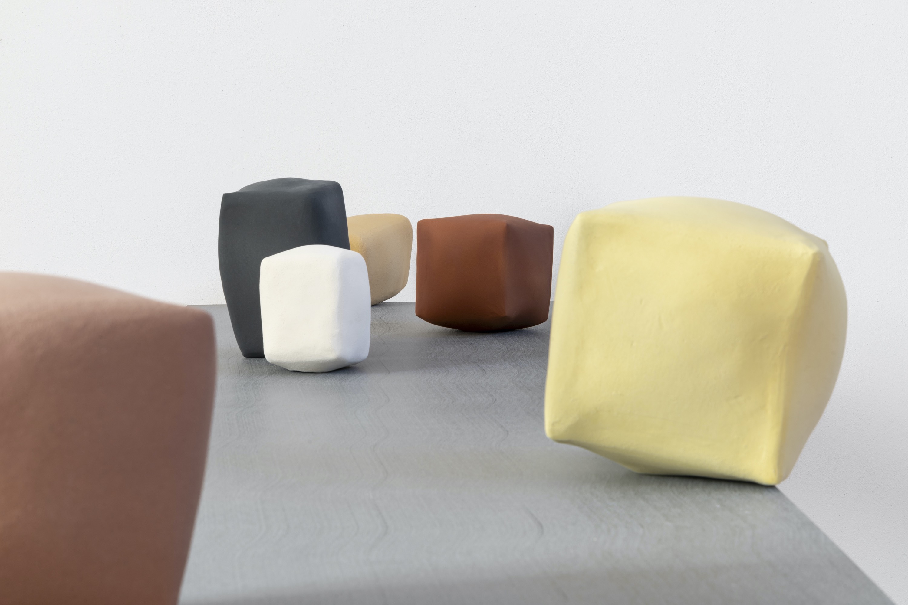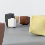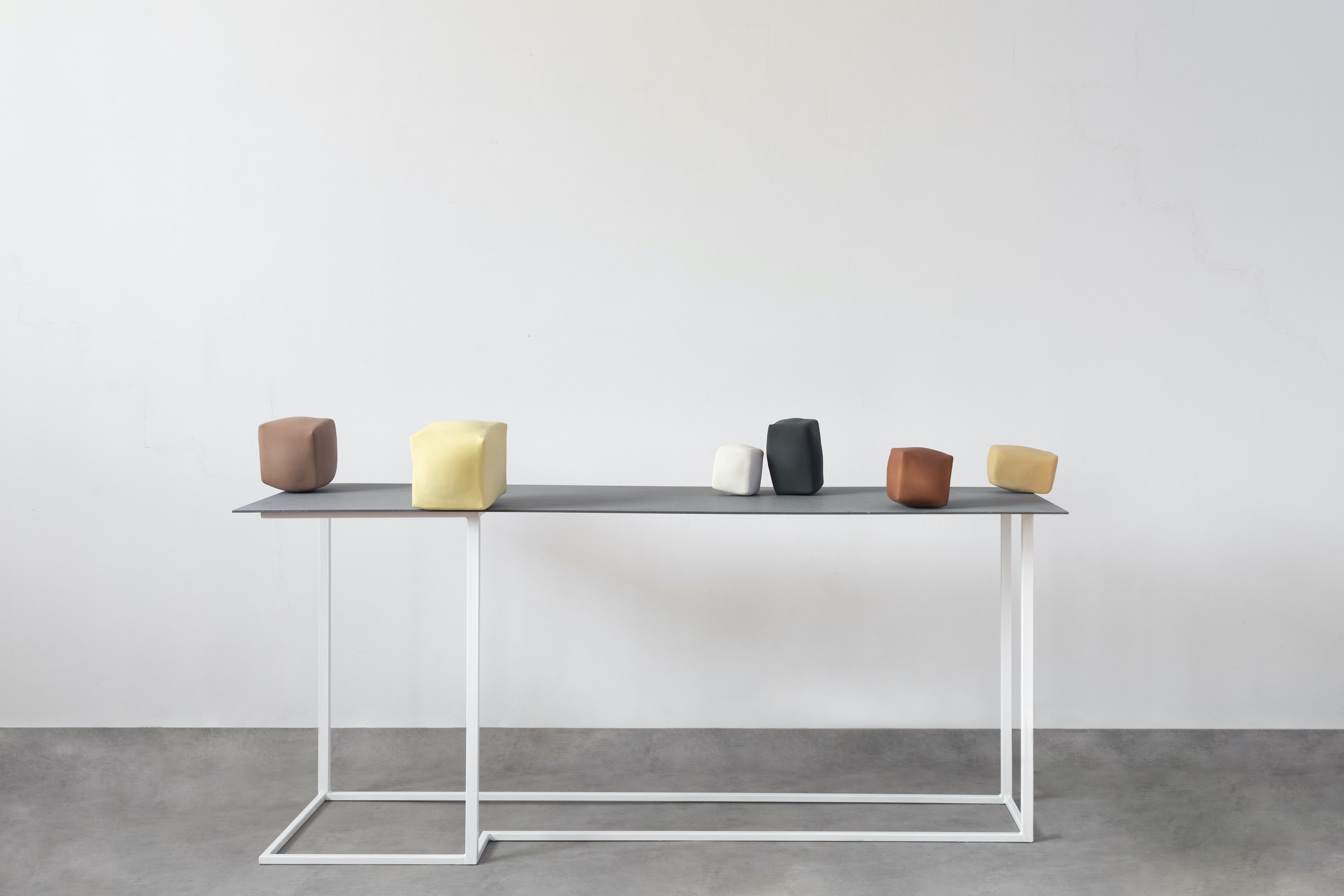 È l’opera L’instabilité (2024), per prima, a offrirci questa idea di trasformazione. Alcune forme, ognuna diversa, sono in relazione, in un rapporto quasi di interdipendenza, su un piano in fibrocemento. Personificano dei movimenti, delle pulsioni, stati di passaggio, di bilico, di pericolo, anche. Sono forme colorate, con una patina opaca, hanno l’opacità dei colori terrosi — gli ingobbi sono terre — e un aspetto pittorico che fa pensare tanto alla nostra storia della pittura quanto ai vulcani e ai deserti. Anche Leoncillo respinge la colorazione, facendo di ogni colore qualcosa di necessario. Lo dice magnificamente nel suo Piccolo diario: “Non più colore ma materia che ha un colore, non più volume ma materia che ha un volume”.