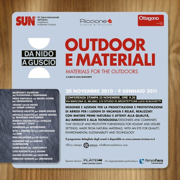 “Da nido a guscio” è un progetto nato nel 2007 dalla collaborazione tra Ottagono e il SUN, il Salone Internazionale dell’Esterno, Progettazione, Arredamento e Accessori di Rimini. La sfida: stimolare la progettazione in ambiti particolari e spesso trascurati dell’arredo per esterni. L’innovazione era anche quella di richiedere la possibilità di “incubare” il prototipo, ovvero di farlo entrare in produzione grazie alla connessione con le grandi aziende. Ogni anno è stato scelto un tema, quest’anno quello della eco-compatibilità e dei materiali naturali.