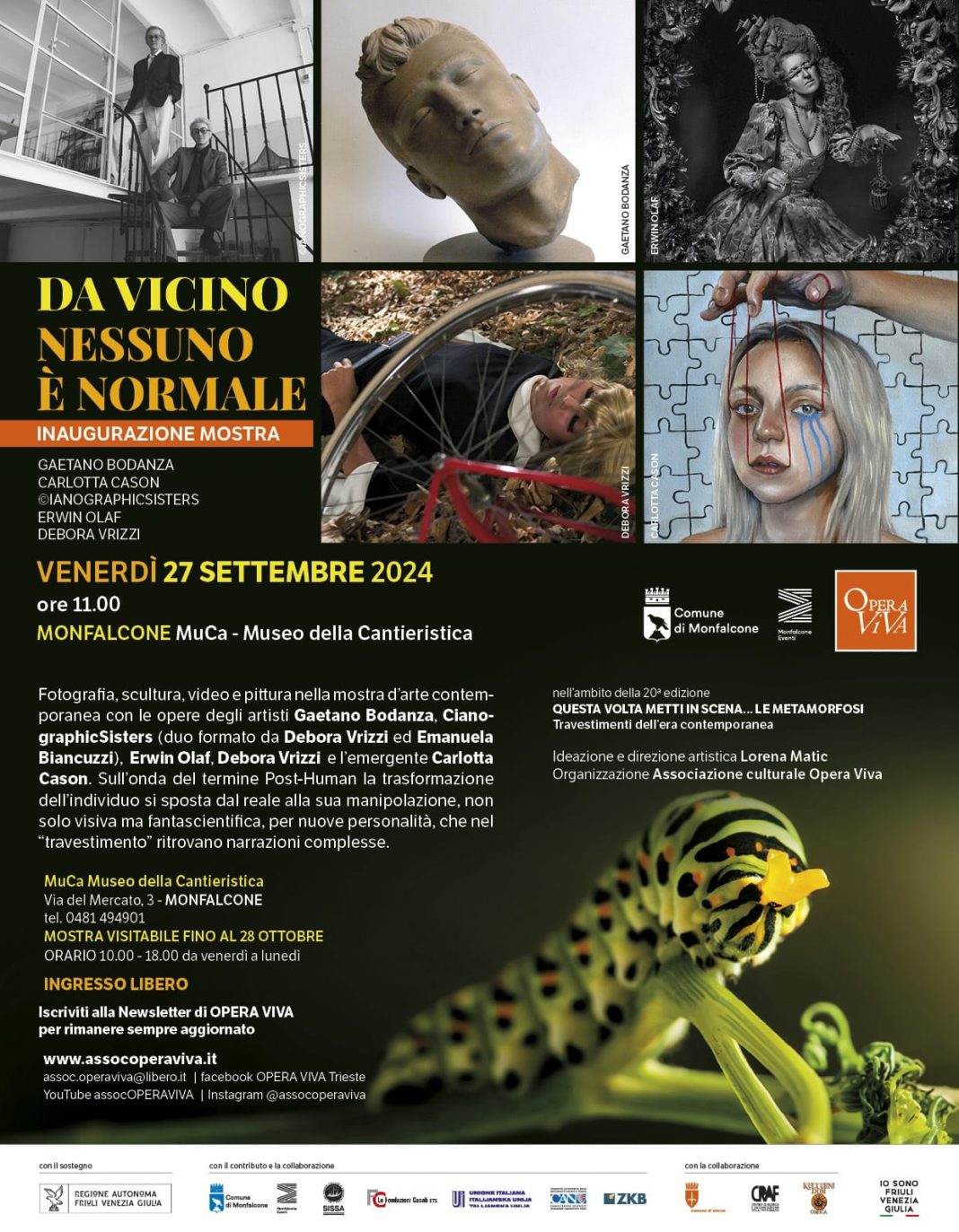 S'inaugura la mostra d'arte contemporanea “Da vicino nessuno è normale” al MuCa - Museo della Cantieristica di Monfalcone, venerdì 27 settembre alle ore 11.00, con un omaggio la fotografo olandese Erwin Olaf (deceduto nel 2023 a 64 anni), famoso a livello mondiale per i suoi ritratti dalla composizione teatrale, spesso dal sapore nostalgico e surreale, e per quelli alla famiglia reale olandese. Le sue opere si trovano nelle collezioni dei Musei più importanti al mondo, Stadelijk Museum di Amsterdam, Ludwig di Colonia, Central Museum di Utrecht.