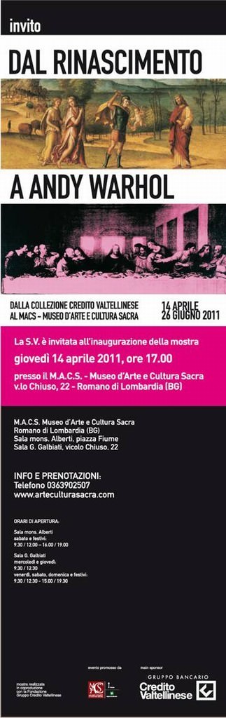 La Fondazione Gruppo Credito Valtellinese insieme al M.A.C.S. Museo d’Arte e Cultura Sacra di Romano di Lombardia allestirà nei locali del museo lombardo, una mostra incentrata sui dipinti a tematica religiosa di proprietà della banca, a partire dal 14 aprile fino al 26 giugno.
