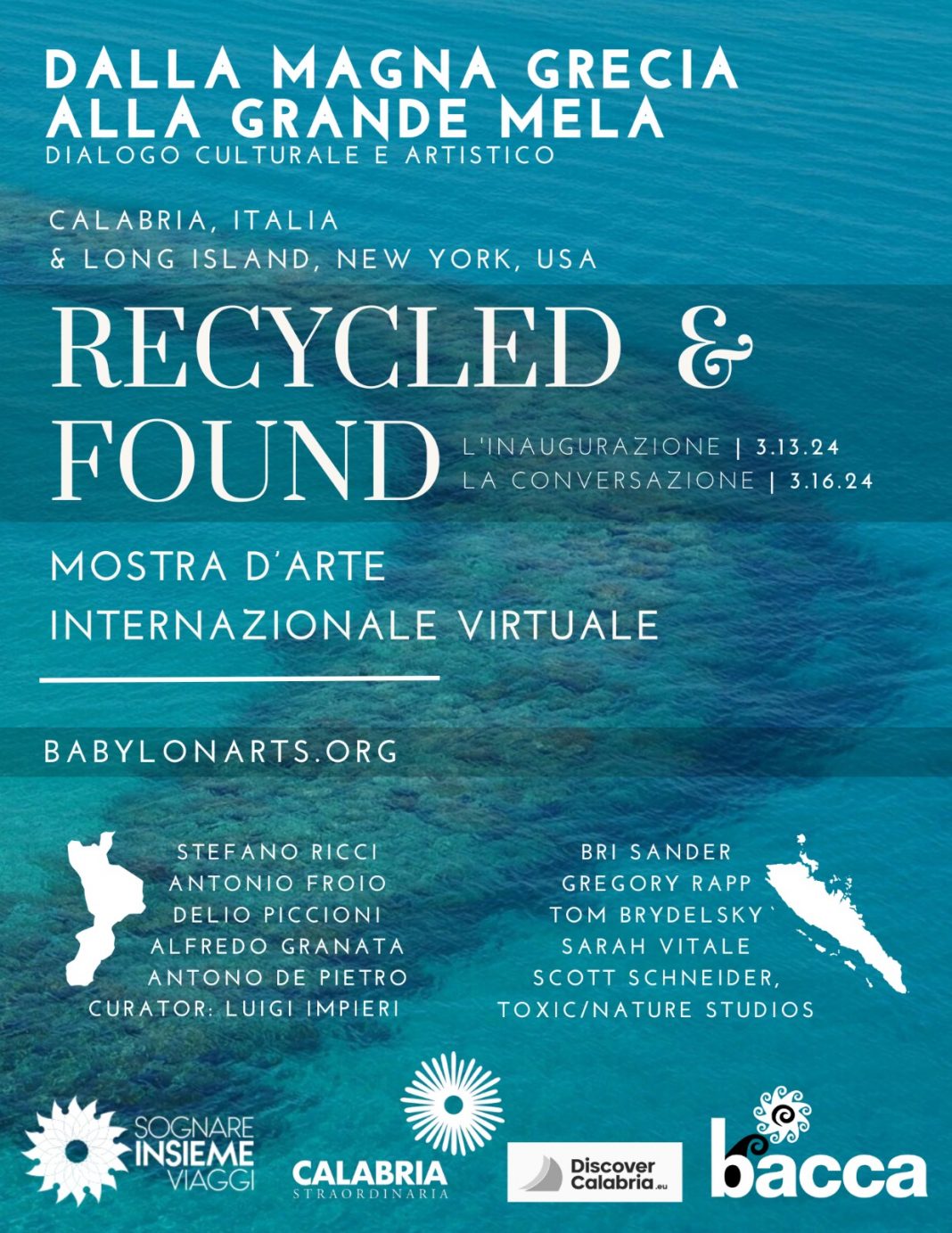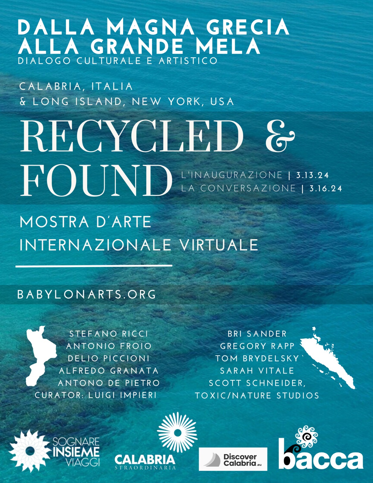 Il titolo ideato dall’artista Stefano Ricci, ha a che fare con una mostra virtuale organizzata da BACCA (Babylon Citzens Council on the Art) e Sognare Insieme Viaggi. Il sottotitolo è: Dialogo Culturale e Artistico, Calabria, Italia & Long Island, New York, USA, Recycled & Found. La galleria è sempre aperta ed è visitabile sulla piattaforma di BACCA, https://www.babylonarts.org/recycled-found-exhibition. Qui si potranno visionare molte opere, create da un gruppo di artisti italiani e americani, che si sono incontrati virtualmente sulla piattaforma di un ponte immaginario a seguito di una serie di incontri e discussioni, effettuate per via telematica, col fine di trovare una proposta artistica convincente, avvincente e capace di far dialogare la vecchia Europa col nuovo mondo, l’America (il cui nome dipende dell'esploratore italiano Amerigo Vespucci, il quale, per primo capì che le nuove terre non erano un'appendice delle ‘Indie’, ossia dell'Asia, ma un continente a sé). I punti d’innesto su cui appoggia questa iniziativa artistico e culturale, comprendono da una parte la Calabria, terra da cui deriva il nome Italia (“La regione, che ora chiamasi Italia, anticamente tennero gli Enotri; un certo tempo il loro re era Italo, e allora mutarono il loro nome in Itali”, Antioco di Siracusa, in Dionigi d’Alicarnasso) e che gli antichi romani chiameranno Magna Grecia e, dall’altra, gli U.S.A. ma in particolare New York City, la “Grande Mela”, cuore indiscusso della cultura contemporanea. Nella mostra che si è aperta il 13 marzo 2024 e che chiuderà i battenti il 31 dicembre 2024, sono stati coinvolti alcuni artisti italiani (Stefano Ricci, Antonio Froio, Delio Piccioni, Alfredo Granata, Antonio de Pietro e in qualità di curatore, Luigi Impieri) e americani (Bri Sander, Gregory Rapp, Tom Brydelsky, Sarah Vitale, Scott Schneider, Toxic/Nature Studios). Il proposito di chi vi partecipa è quello di mettere in relazione le opere, per aprire una discussione artistica, in cui coniugare il concetto del bello, con quello del del buono e del giusto, così come lo avevano coniato gli antichi greci nella definizione di “kalòs kai agathòs”. Gli artisti coinvolti in questo progetto, ideato da Liz Mirarchi, Angela Donato e Lucia Chierici, vorrebbero mettere al centro degli interessi della mostra, il valore etico oltre che estetico dell’arte, ponendo soprattutto l’accento su certe contraddizioni dei nostri tempi moderni, che tradiscono quell’antica ma straordinaria affermazione. Come tanti cittadini comuni, i partecipanti all’esposizione virtuale sono particolarmente interessati ad avere quale nucleo del dialogo artistico/culturale il tema dell’inquinamento ambientale, le cui conseguenze se le confrontiamo alla luce del significato implicito della definizione di kalokagathia preoccupano. Si conoscono ad esempio i danni irreparabili arrecati da un’industrializzazione iper produttiva e del suo impatto sull’ambiente, con tanto di danneggiamento del nostro patrimonio culturale. Dunque scopo di questa mostra è creare un percorso che conduca l’osservatore sicuramente a godere delle opere esposte anche in senso squisitamente estetico, visto che queste procurano emozioni che fanno bene alla testa e al cuore. Allo stesso tempo dobbiamo però affermare che esse sono state create per essere anche buone e giuste, ovvero generate attraverso un’approccio etico, che induce gli artisti a prendere coscienza del fatto che si possono risparmiare le risorse naturali, riducendo le emissioni inquinanti nell’aria, nell’acqua e nel territorio, generando minori quantità di rifiuti, al fine di salvaguardare il pianeta. Un problema questo del quale il mondo dell’arte se ne deve fare carico. Come affermerà Duchamp, bisogna liberarsi di un’arte fatta solo per la vista: “l’arte non dev’essere esclusivamente visiva o retinica. Deve interessare anche la materia grigia, il nostro appetito di comprensione”. Chi partecipa a vario titolo a questa mostra, si sente animato, come qualunque cittadino sensibile, a comprendere il mondo che lo circonda, a mettersi in armonia con esso, nel tentativo di poterlo rappresentare, difendendolo dai rischi che corre, non a caso seguendo gli insegnamenti dei “pitagorici”, (ovvero i filosofi seguaci da Pitagora, nativo di Samo ma trasferitosi a Crotone, Magna Grecia, oggi Calabria, dove fonda la sua scuola di filosofia), che molto hanno detto sul concetto di armonia e bellezza. L'auspicio è per il mestiere dell’artista e per chi si ritiene promotore dell’arte, di avere un approccio attento a salvaguardare l’ambiente attraverso la realizzazione di opere che prevedano il riuso di materiali naturali, oggetti dismessi e/o dimenticati: chiodi, corde, carte, tessuti, terrecotte, ferri, legni…o frutto di scarti dell’attuale produzione industriale, abbandonati nell’ambiente: reti, plastiche, catrame, tessuti sintetici, elastici, metalli…Come scrive Mattia Mezzetti, in “Rigeneriamo il territorio”, il consumismo esasperato che contraddistingue lo stile di vita occidentale, e sempre più anche quello dei Paesi in via di sviluppo, è nocivo e diseducativo. Creiamo una quantità di rifiuti eccessiva, che invade i nostri spazi vitali. Siamo ormai abituati a pensare che ogni cosa, dopo aver svolto il suo compito, vada gettata senza pensare alle conseguenze del gesto. È però possibile dare nuova vita a quel che viene buttato, rigenerandolo sotto forma di arte. La creatività, esattamente come i rifiuti, è parte della nostra vita quotidiana. Contrapporsi alla (sotto) cultura dell’usa e getta, che ci porta a generare montagne di scarti, esprime civiltà e sensibilità. Servendosi di talento e inventiva, è possibile donare bellezza allo scarto e restituire alla comunità un’opera d’arte. Il riciclaggio artistico crea valore laddove non sembra essercene alcuno e consegna un messaggio importante: lo scarto è una risorsa.