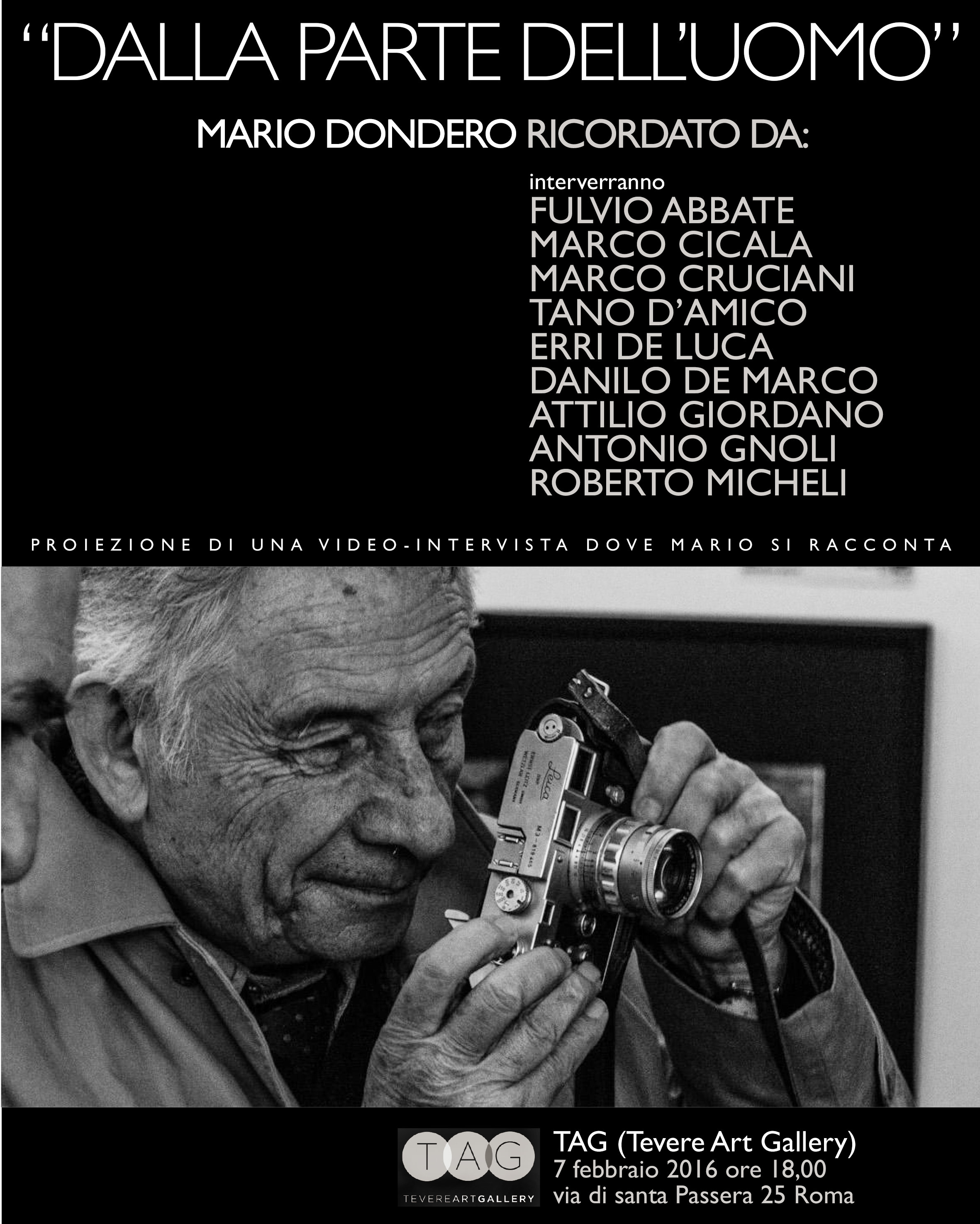 “Dalla Parte dell’uomo” è il titolo di un libro di Mario Dondero, ed è anche il titolo della serata in suo omaggio, interverranno: Fulvio Abbate, Marco Cicala, Marco Cruciani, Tano D’Amico, Erri De Luca, Danilo De Marco, Attilio Giordano, Antonio Gnoli, Roberto Micheli.