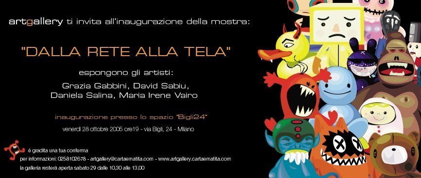 Inaugura venerdì 28 ottobre alle 19.00 presso Bigli24 a Milano “DALLA RETE ALLA TELA”, la collettiva di artisti che hanno già esposto in Artgallery www.artgallery.cartaematita.com , la Galleria d’Arte on line di Carta e Matita. In questa occasione si presenterà la nuova veste grafica del sito Artgallery e finalmente si conosceranno alcuni degli artisti già coinvolti nel progetto.