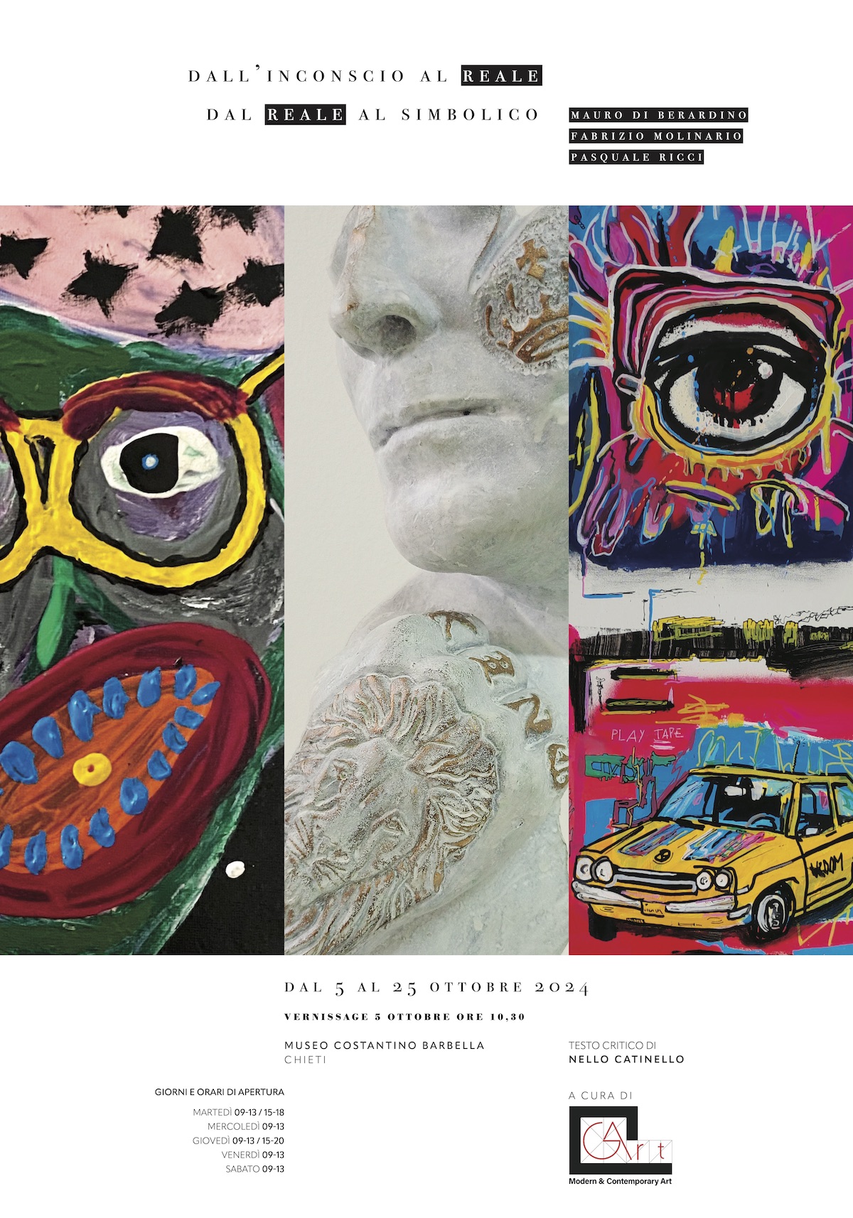 Sabato 5 ottobre 2024 dalle ore 10.30, GArt Gallery Modern & Contemporary Art presenta, negli spazi del Museo Costantino Barbella di Chieti, la mostra Dall’inconscio al reale, dal reale al simbolico con le opere di Mauro Di Berardino, Fabrizio Molinario e Pasquale Ricci e accompagnata dai testi critici di Nello Catinello.