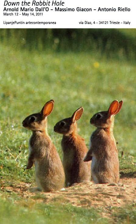 In Down the Rabbit Hole, Arnold Mario Dall’O, Massimo Giacon e Antonio Riello ci conducono, attraverso i loro lavori, in uno strano mondo in costante bilico fra fantasia e realtà, fra animalità e umanizzazione della stessa, dove però anche le cose più semplici, le più normali e banali appaiono buffe, stravaganti e apparentemente ingarbugliate. Così come in Alice in Wonderland, Dall’O, Giacon e Riello, accomunati come sono dalla necessità di incuriosire e stupire, ci servono il loro personale viaggio nel paese delle meraviglie: una continua, costante sorpresa dove senza dubbio, molto di più degli altri esseri, è il coniglio a dominare la scena. Un coniglio, come quello di Alice, che è il perfetto traghettatore fra il mondo della realtà e quello dell’arte contemporanea, un luogo fantastico ma per molti ancora incomprensibile.