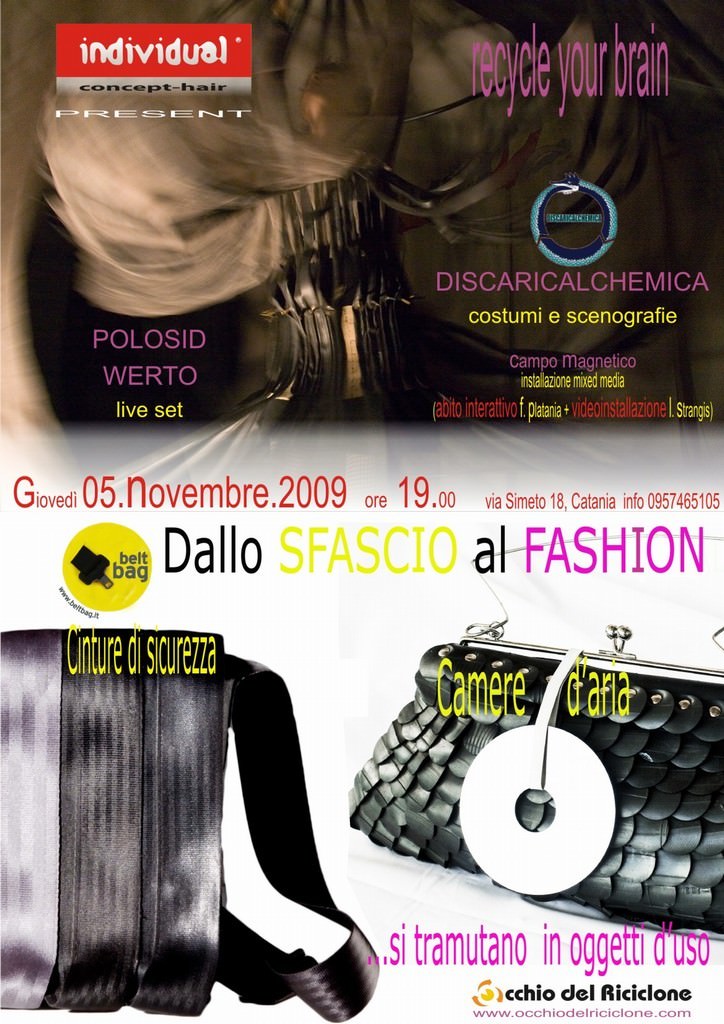 Per il primo appuntamento della stagione con aperitivo e dj set e con Individual-Art, il prossimo giovedì 5 novembre 2009 dalle 19 alle 23, Individual fa un ritorno alle origini, un tuffo nel passato e precisamente al 2007, con il format Recycle your brain. Proponendo x la prima volta dal laboratorio di riuso e riciclo Occhio del Riciclone, prende forma DiscaricalchemicA, una linea di costumi e scenografie di Francesca Patania e Aurelia Laurenti, con lintento di usarle come strumento di assorbimento, trasformazione ed espressione delle emozioni dellimmaginario collettivo.