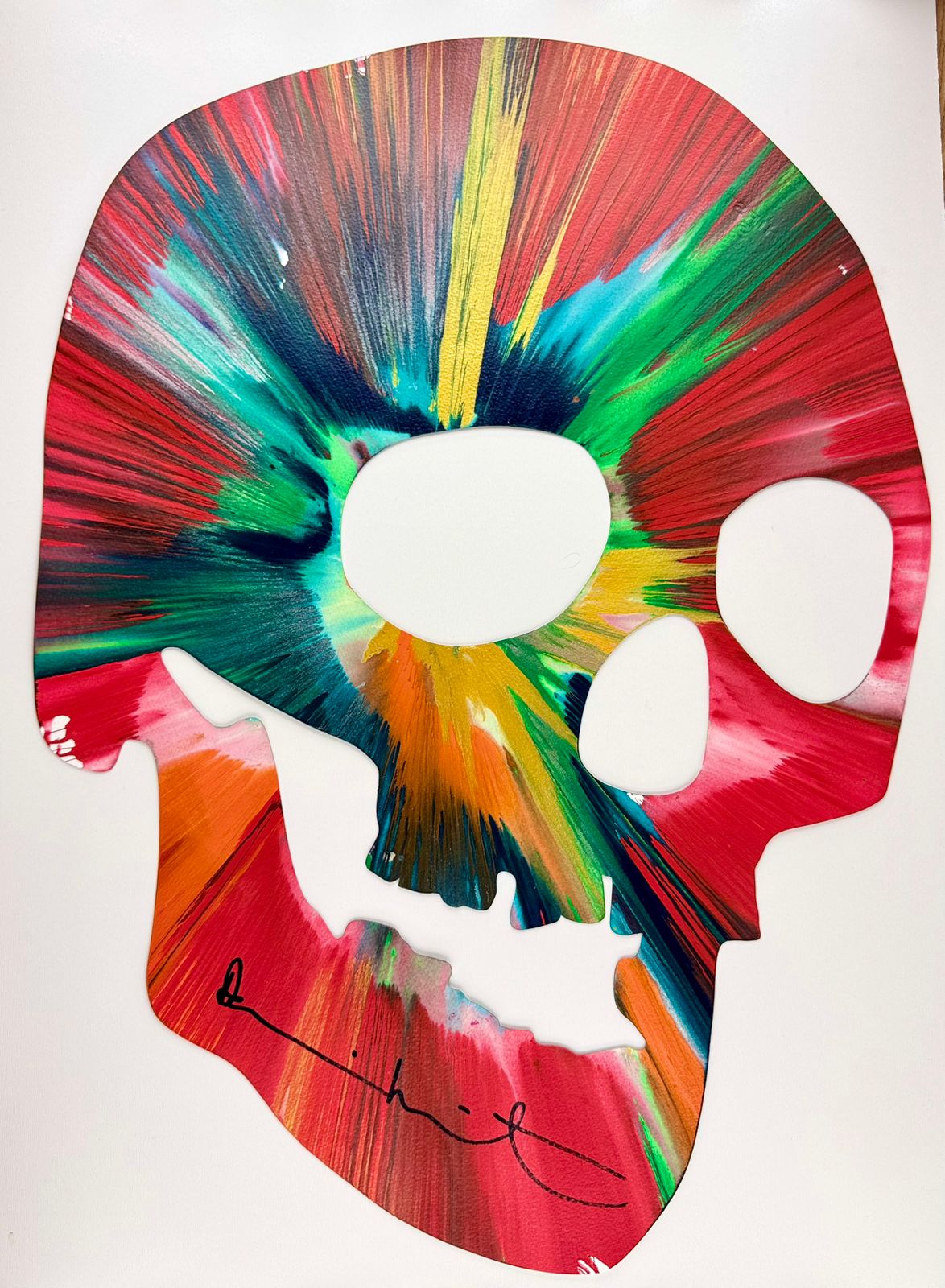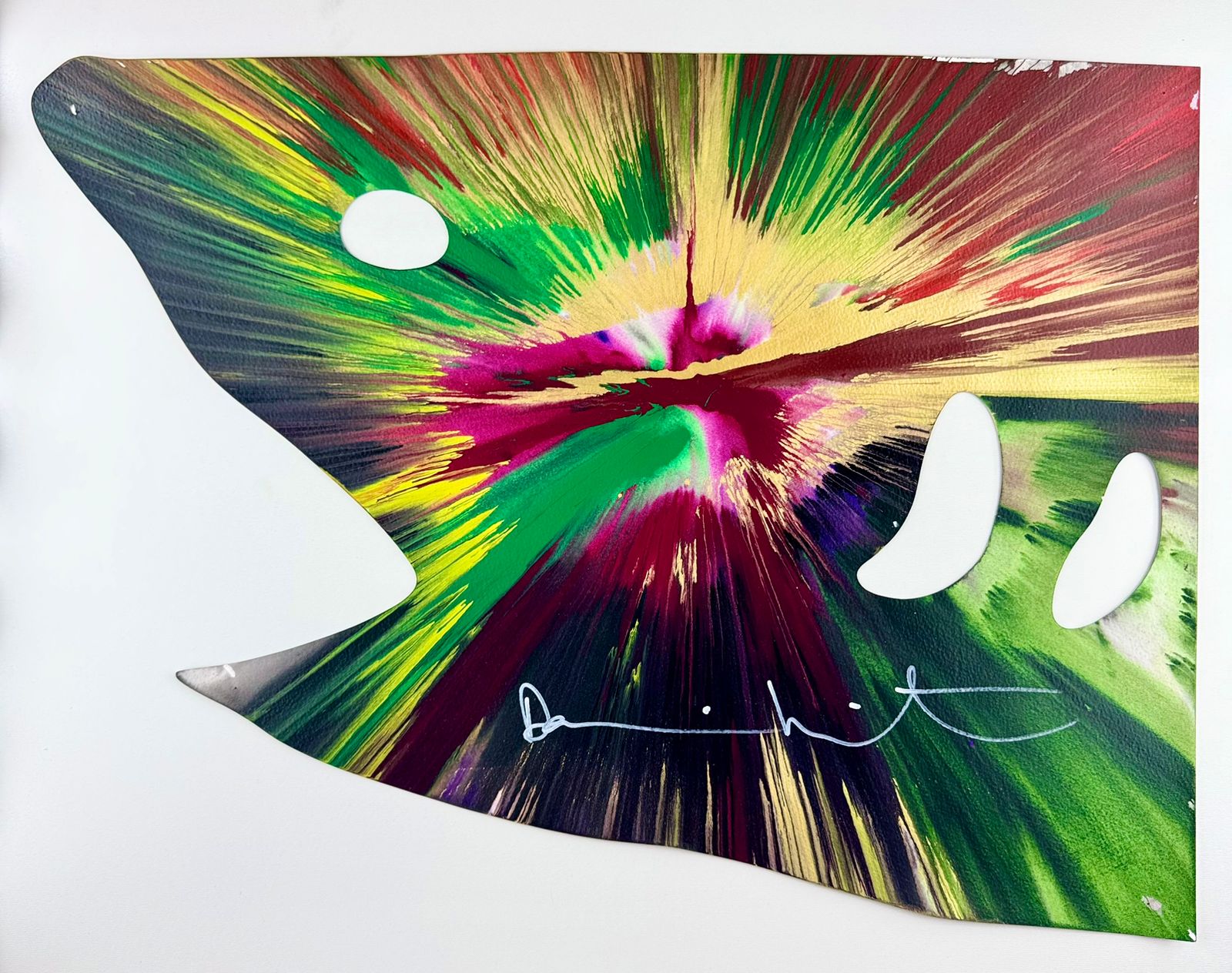In occasione della mostra, il pubblico avrà l’opportunità di scoprire una selezione di Spin Paintings, tra le serie più iconiche e sorprendenti di Hirst. In queste opere l’artista affida al movimento e al caso la costruzione dell’immagine: il colore viene gettato su tele in rotazione e la forza centrifuga lo distribuisce in traiettorie imprevedibili, generando composizioni radiali di forte impatto visivo. Il risultato è un’esplosione di energia, vitalità e libertà creativa, che riflette l’amore di Hirst per la potenza espressiva del colore. Pur nella loro apparente leggerezza, le Spin Paintings si collocano all’interno di un percorso più ampio, in cui l’artista continua a interrogarsi sul rapporto profondo tra vita, morte e fragilità umana, temi che da sempre costituiscono il filo conduttore della sua ricerca.
