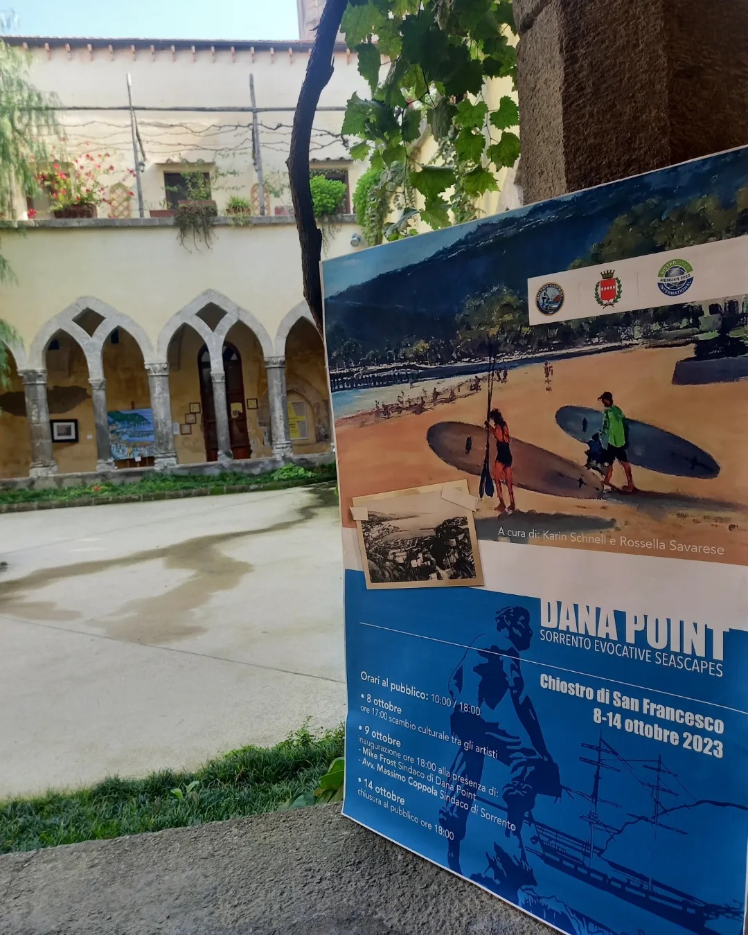 La Città di Sorrento e Dana Point Sister Cities International presentano la mostra collettiva intitolata “ Dana Point - Sorrento evocative seascapes” visitabile al Chiostro di San Francesco, a Sorrento dall’8 al 14 ottobre 2023, a cura di Karin Schnell Dana Point Sister Cities International Ambasciatrice per l’Arte e Rossella Savarese Storico dell’Arte, gallerista e curatrice SyArt Gallery.