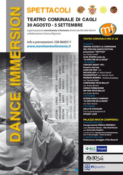 E’ fissato per domenica 30 agosto l’apertura di “Dance Immersion” evento dedicato alla danza e alle arti visive. Il progetto curato da Benilde Marini dell’Associazione Culturale e sportiva movimento e fantasia prevede: due convegni, quattro spettacoli di compagnie di fama nazionale e internazionale, 15 stage, 2 laboratori di danza, una mostra di arte visive e l’assegnazione di borse di studio.