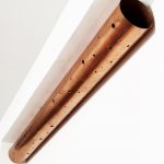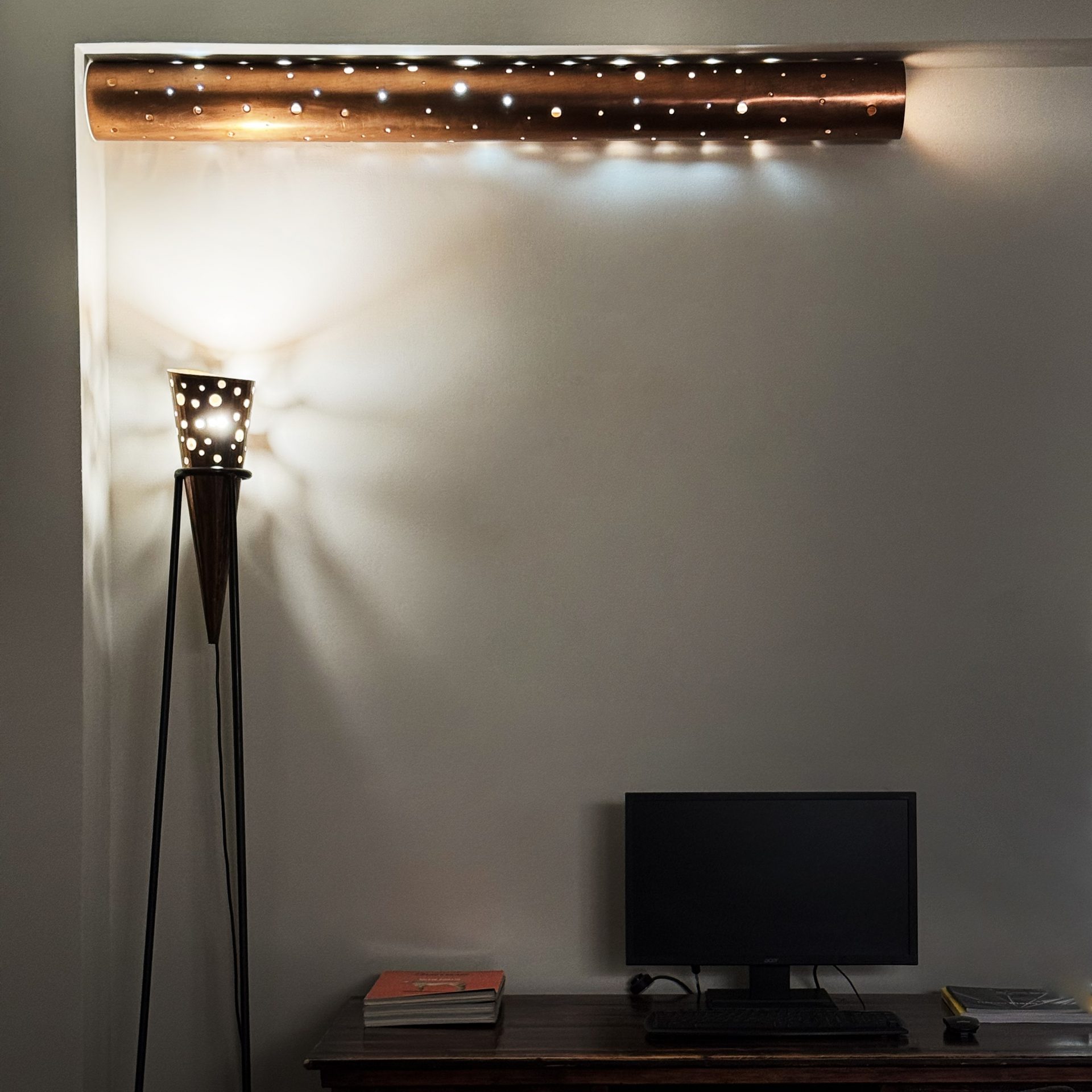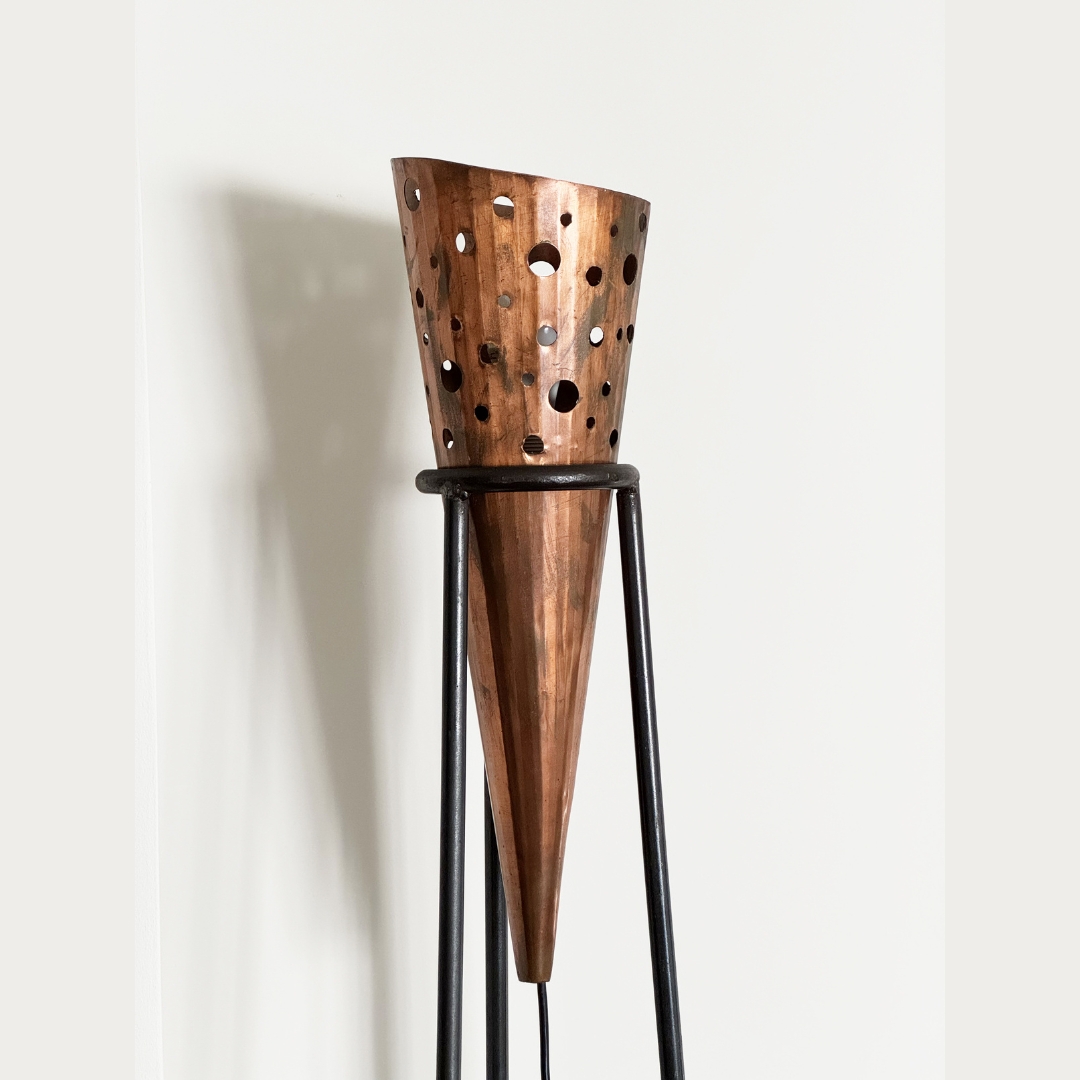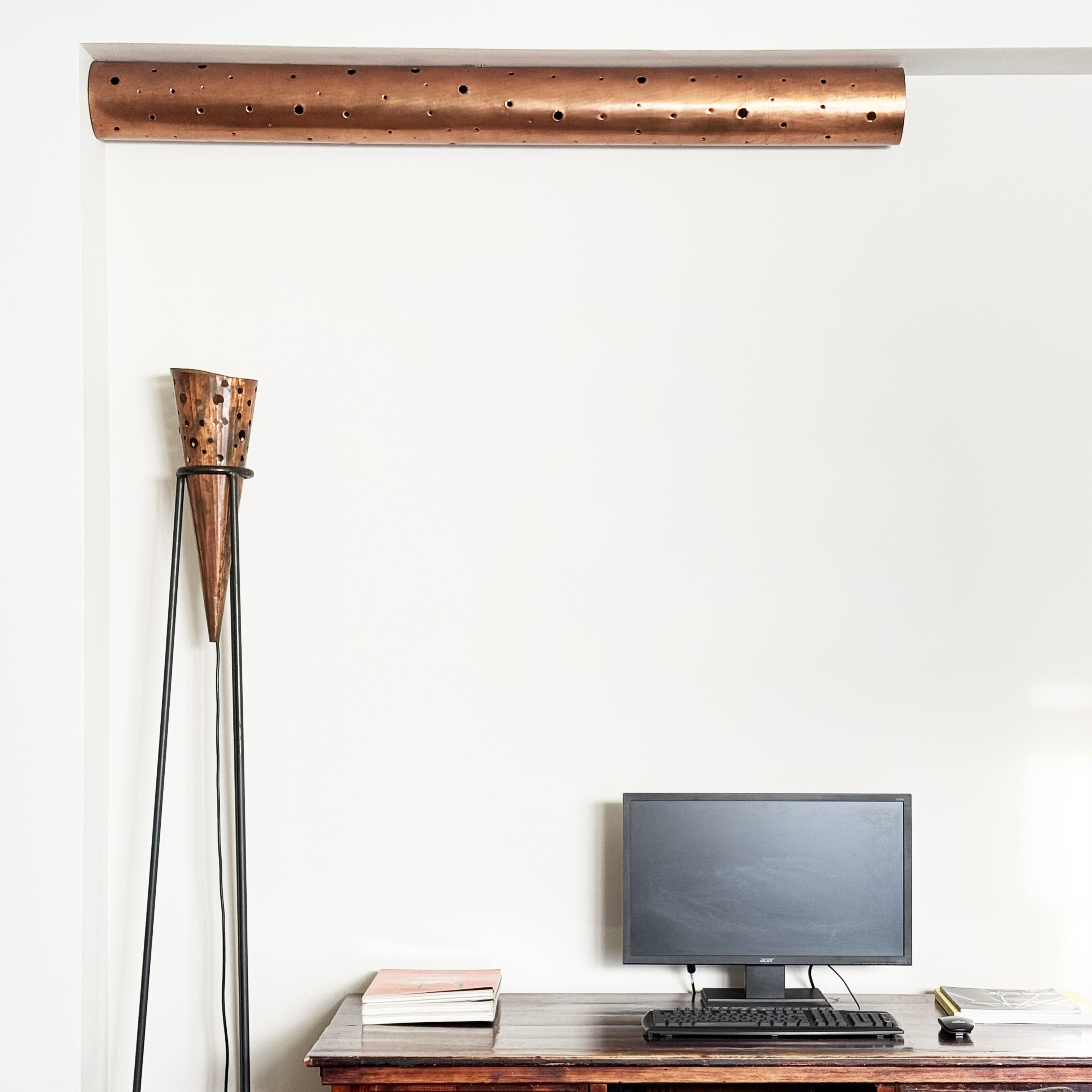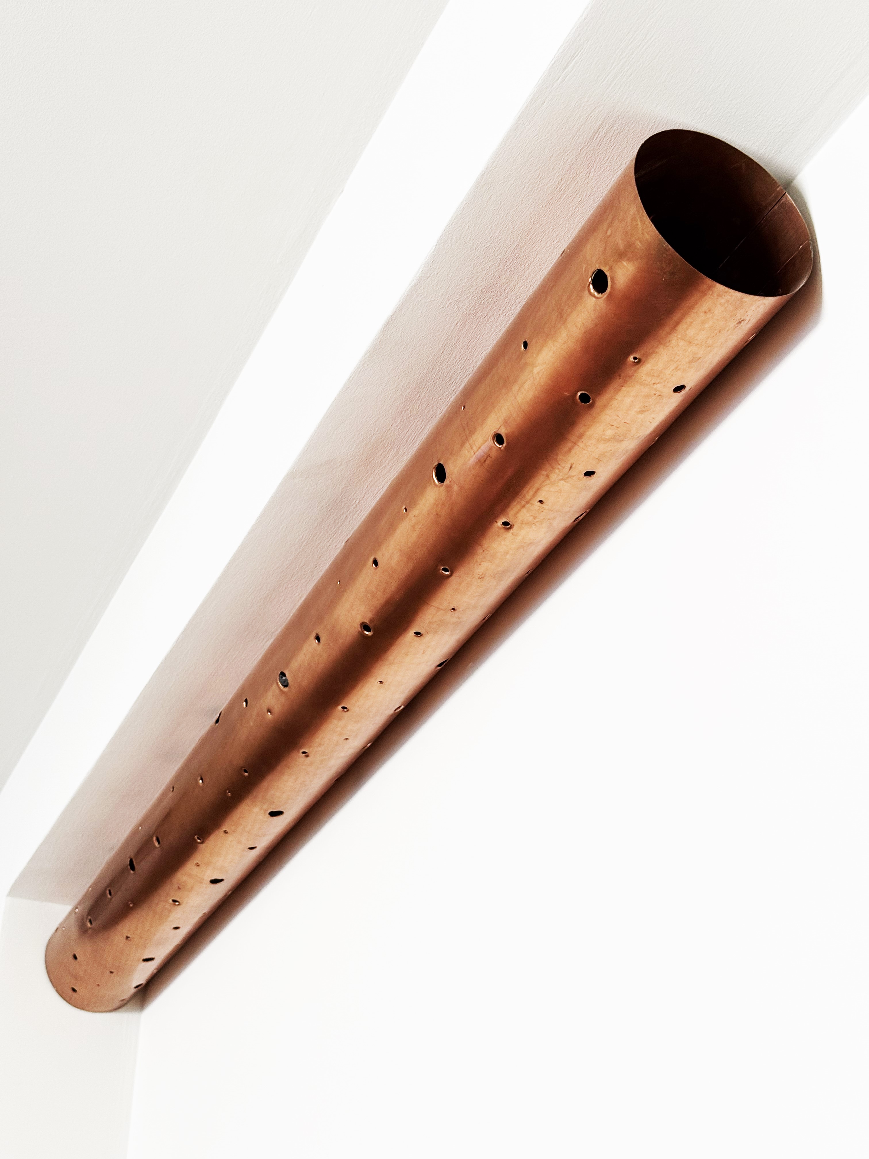 Al centro dell’esposizione, le due lampade della collezione, in cui il rame, sapientemente modellato, si trasforma in un racconto di luce e materia, come stelle danzanti.
